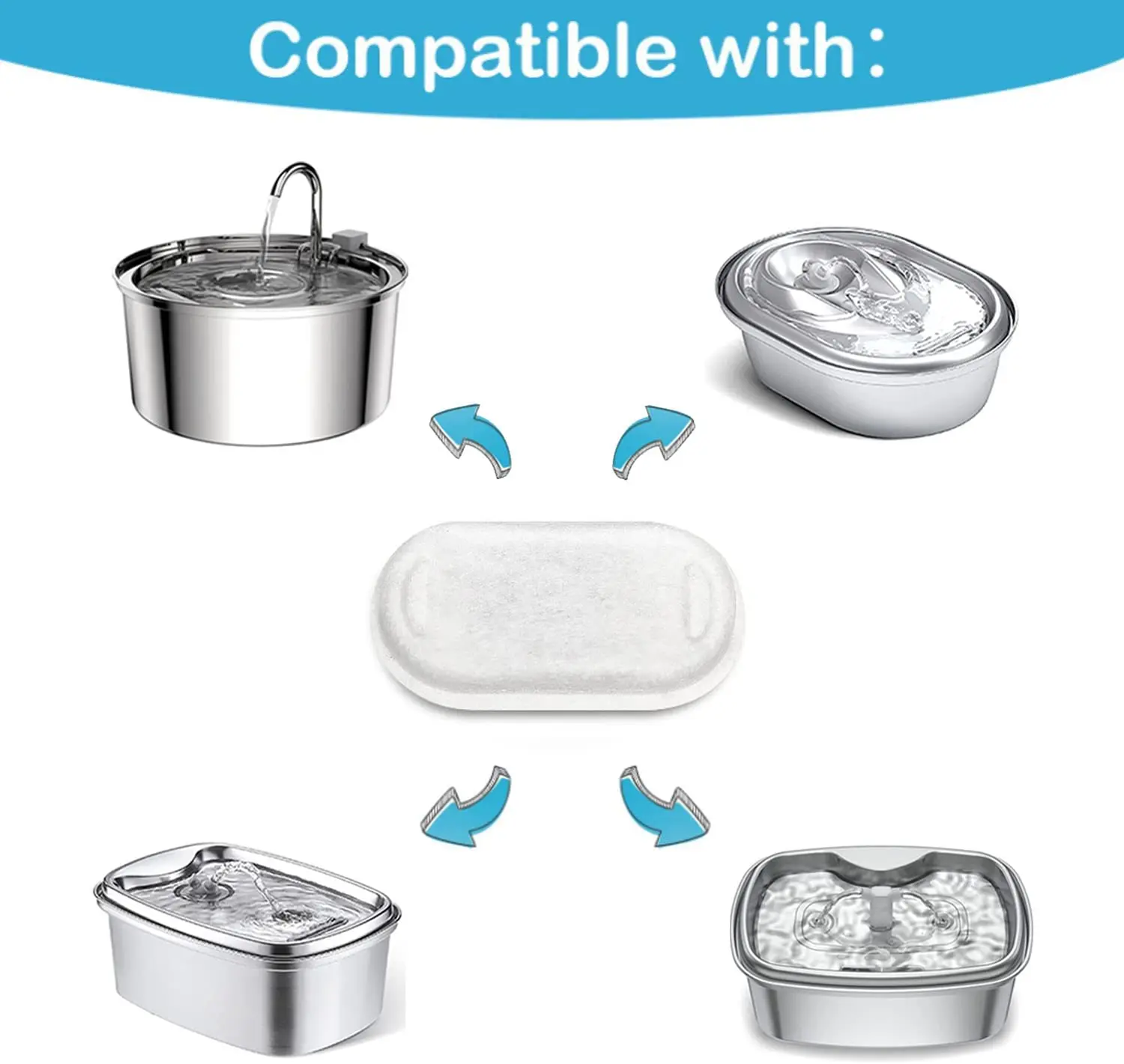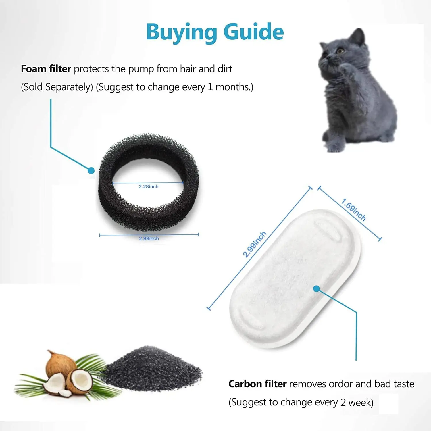 【Compatible con múltiples modelos】Compatible con nuestra fuente de agua para gatos de acero inoxidable de 108oz/3,2 L y 67oz/2L 【Reemplazar regularmente 】La fuente de agua para mascotas debe reemplazar el filtro de carbón cada 4 semanas. (El clima cálido engendra mosquitos, reemplace el filtro de carbón una vez 2 semanas) y reemplace el filtro de espuma cada dos meses para mantener el agua fresca.