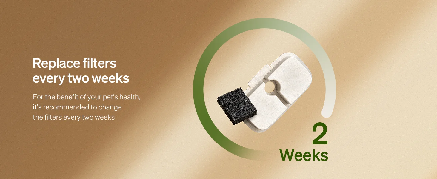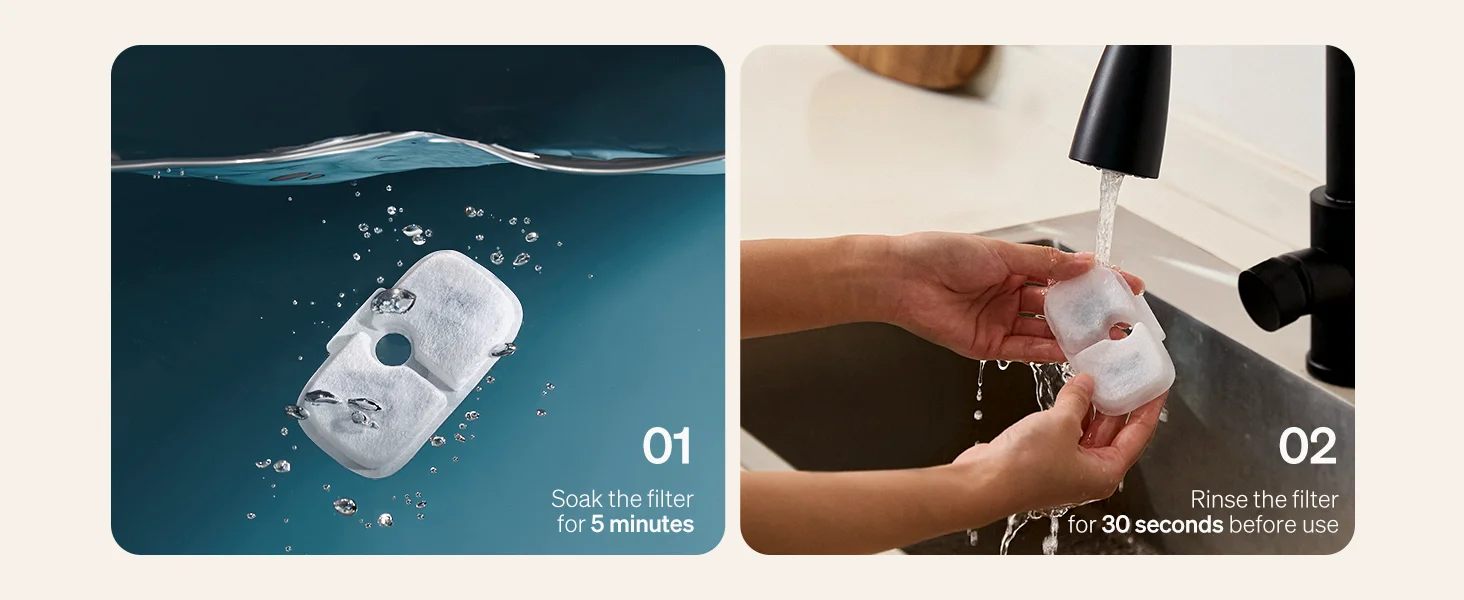 【Sugerencia】 Para obtener los mejores resultados, sumerja el filtro en agua durante 5 minutos antes de usarlo. Enjuague el filtro con agua corriente para eliminar el exceso de polvo de carbón antes de usarlo. Recomendamos reemplazar el filtro cada 2 a 4 semanas, dependiendo de cuántos gatos utilicen la fuente.