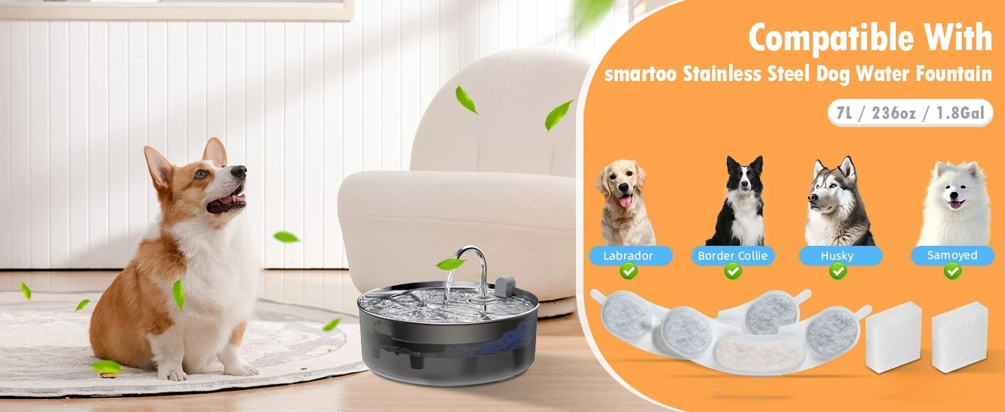Solo compatible con la fuente de agua para perros de acero inoxidable Smartoo 7L/236oz/1.8G: para proteger la salud de su mascota y evitar dañar su fuente, el uso de filtros fuera de marca o falsificados puede reducir el rendimiento de filtración o provocar un mal funcionamiento.