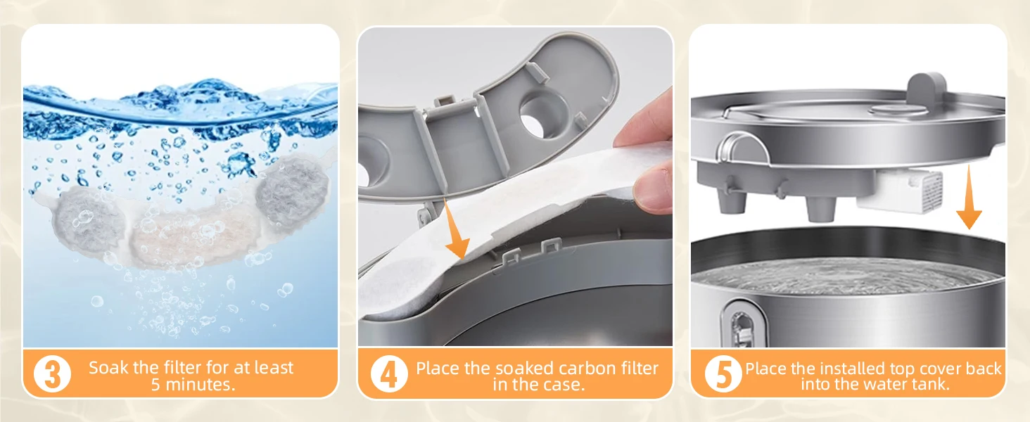 Cómo utilizar: Remoje el filtro en un recipiente limpio durante 5 minutos antes de colocarlo en la fuente de agua.Notas: El filtro debe empaparse completamente antes de encender la fuente.De lo contrario, es posible que el agua no penetre por el lejano y provoque vuelcos.No sumerja el recipiente en el tanque de la fuente para evitar el polvo en la superficie.