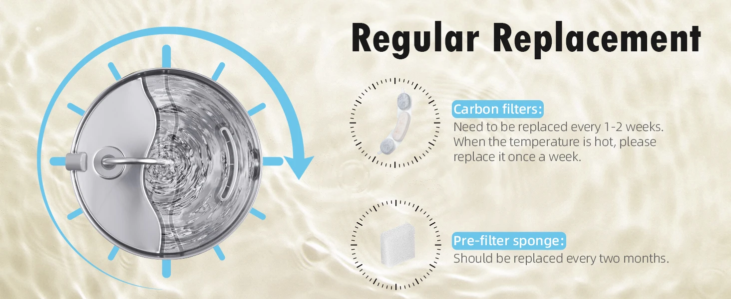 Para mantener un agua limpia y saludable, reemplace el filtro de carbón cada 1 a 2 semanas, semanalmente durante los meses más cálidos. El filtro de espuma debe reemplazarse cada 2 meses. El reemplazo regular ayuda a garantizar agua dulce para su mascota y mantiene la fuente funcionando correctamente