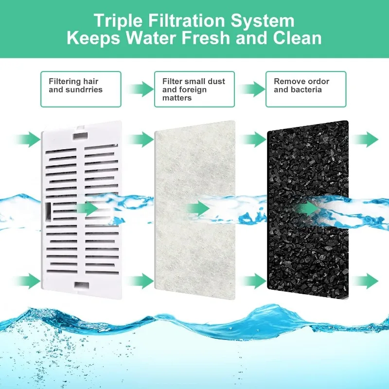 🐕【 Sistema de triple filtración】El Filtro de fuente de agua Cat está hecho de un sistema de filtración de 3 capas, la rejilla ABS de doble cara puede filtrar el cabello y las impurezas grandes, la tela no tejida podría filtrar pequeños sedimentos y escombros, la capa de polvo de carbón activado elimina el cloro y el olor, mantiene el agua fresca y saludable para sus mascotas, previene eficazmente la enfermedad renal.