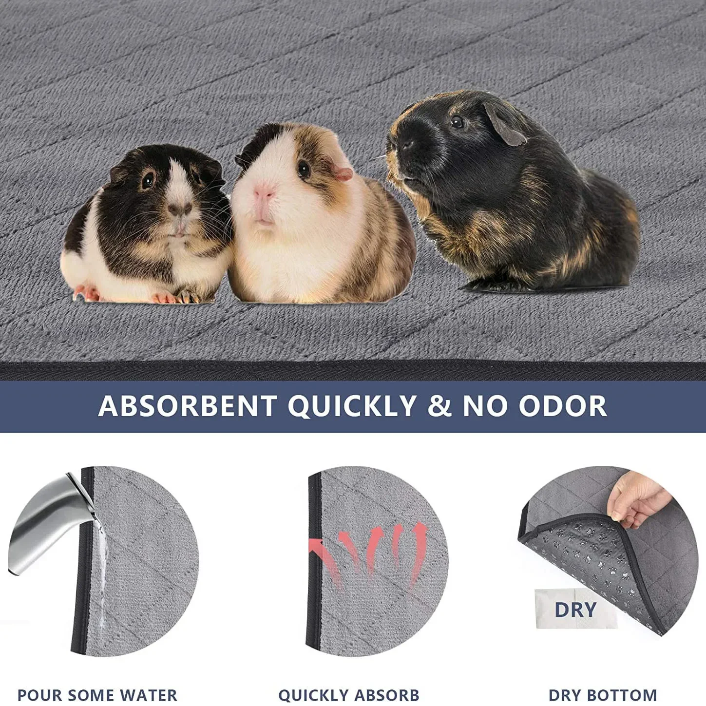 Características:1.Lavable a máquina y reutilizable, fuerte absorción de agua, fondo impermeable, sin filtración de agua para proteger el piso.2.Es muy absorbente, transpirable y antideslizante, puede evitar eficazmente el movimiento y es muy adecuado para que jueguen y descansen mascotas pequeñas.3.La construcción de 4 capas fue diseñada para mantener la jaula, las alfombras y el hogar de su mascota limpios y secos sin ensuciar.4.Adecuado para todas las cerdos de indias, ratas, hámsteres, erizos, chinchillas, hurones, conejos, etc.Especificaciones:Material: forro polar coral, capa interior PUL, tejido de punto de poliéster.Color: Gris oscuroTamaño: 30x30cm/35x50cm OpcionalContenido del paquete:1 x almohadilla para orinar conejillo de indias