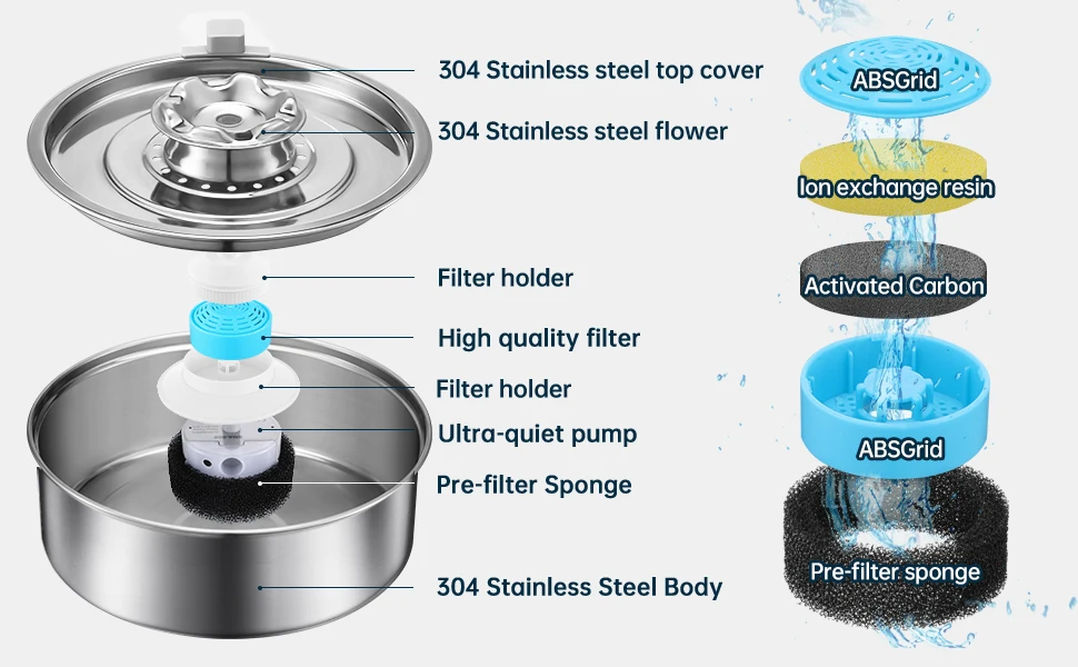◆[Filtrado múltiple]El filtro de la fuente de agua para mascotas está compuesto de algodón, carbón activado y resina de intercambio iónico, que puede purificar el agua y eliminar impurezas, olores y metales pesados en el agua.