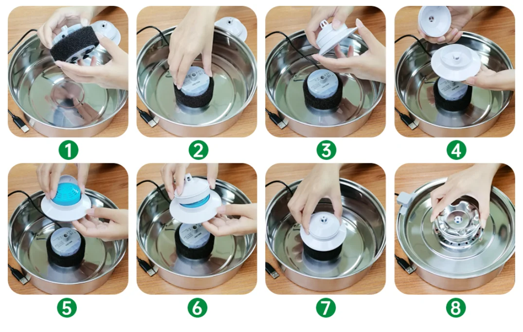1-Por favor, limpie la bomba y el alimentador una vez a la semana, y se sugiere reemplazar el filtro cada 14-20 días.