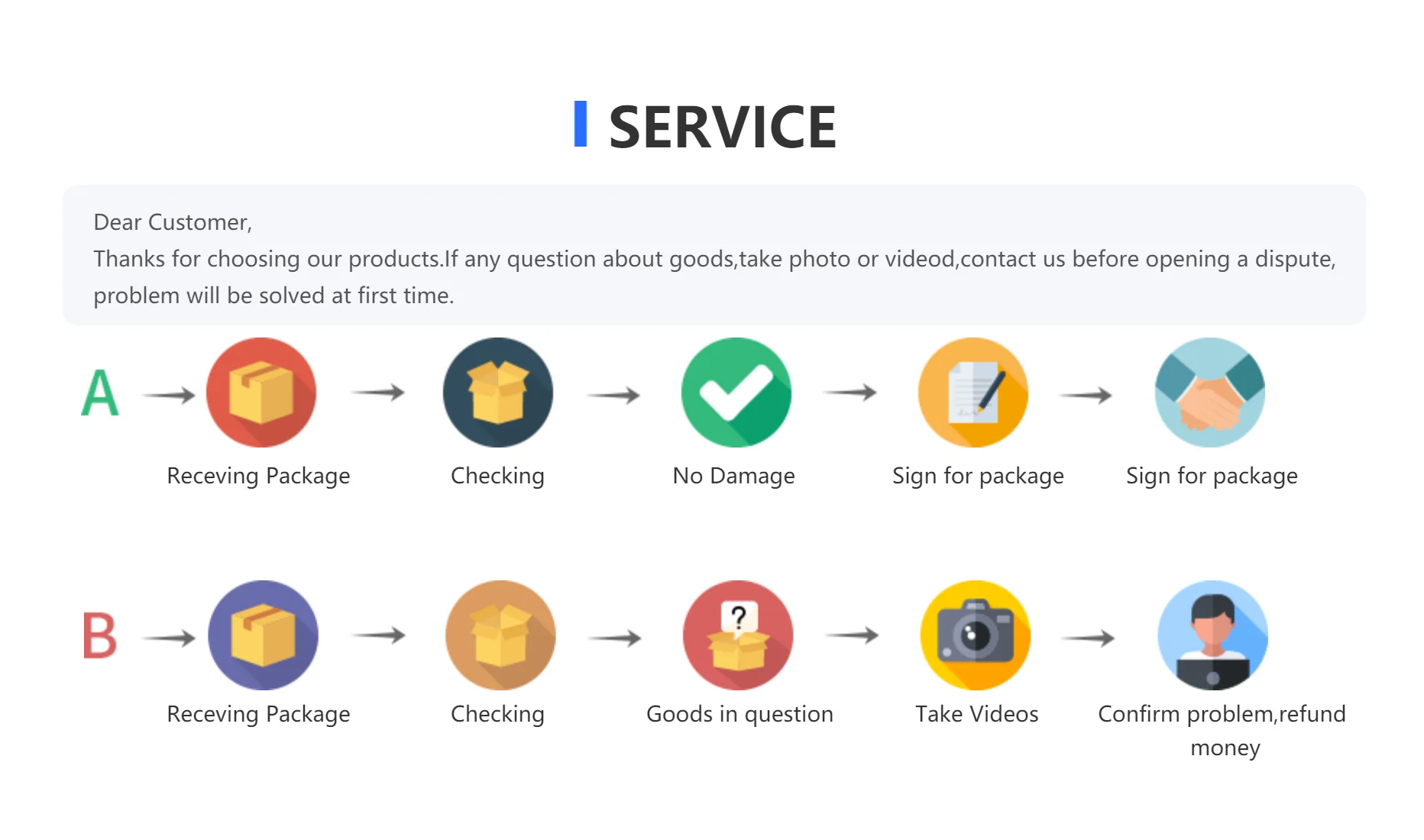 1. Si hay algún problema de calidad con el producto que recibió, contáctenos a tiempo, lo resolveremos a tiempo.