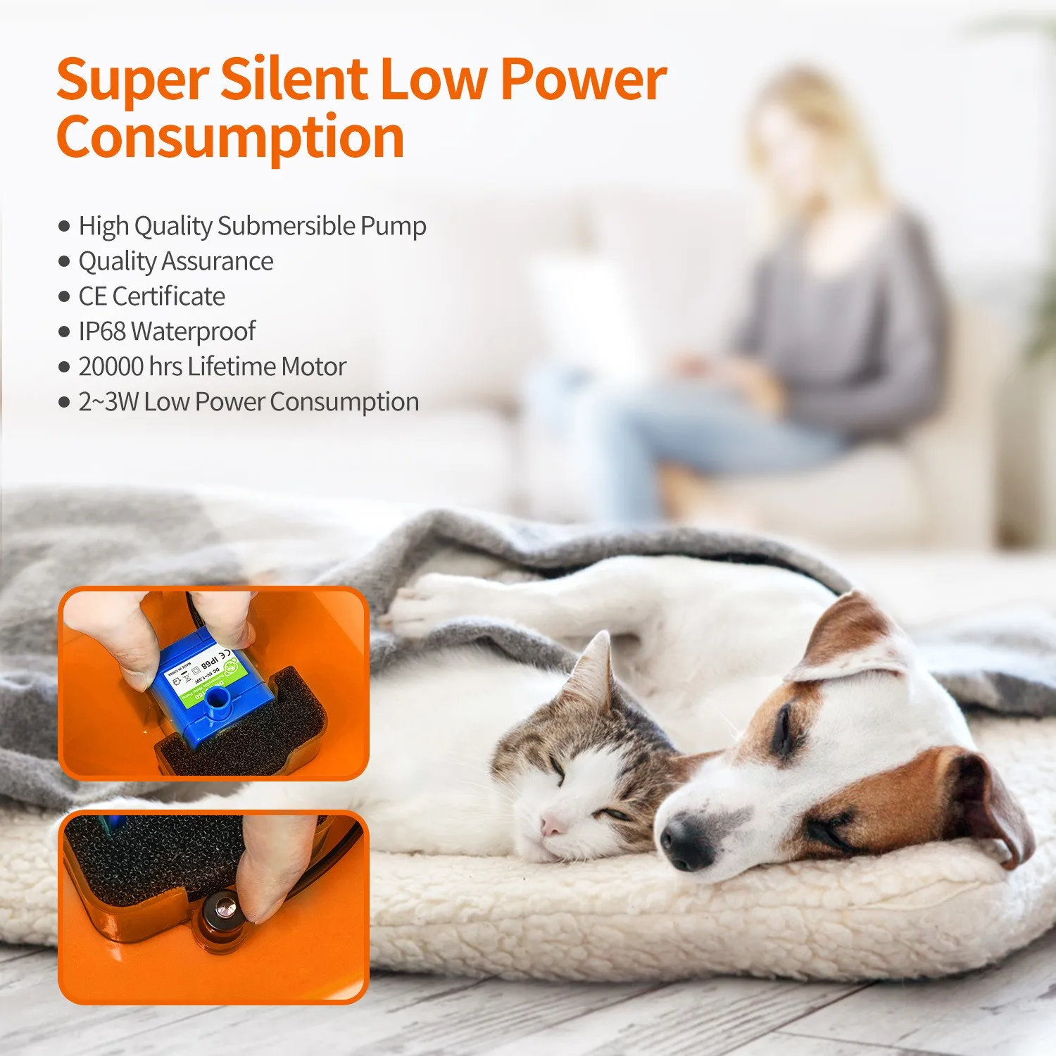 Nuestra fuente de agua automática está diseñada para la salud de su mascota y su conveniencia. Elaborado con material PP apto para mascotas y apto para uso alimentario, proporciona agua pura y fresca. Los tres modos únicos de fuente invitan a las mascotas a beber más, apoyando su salud renal y previniendo la deshidratación. Con una generosa capacidad de 2 litros, es ideal para varias mascotas o para uso durante todo el día. La bomba ultrasilencioso funciona silenciosamente sin molestar su hogar y su diseño desmontable facilita la limpieza.