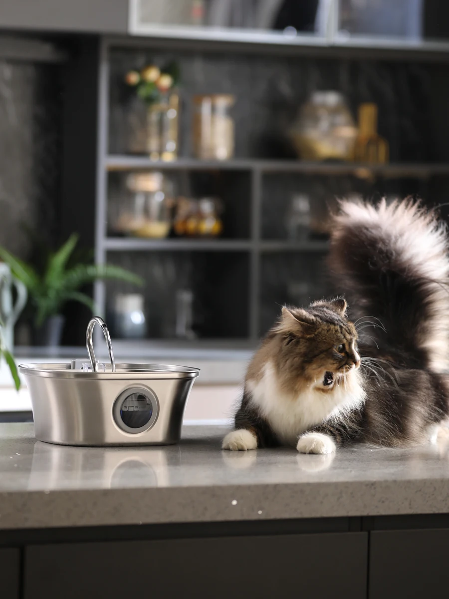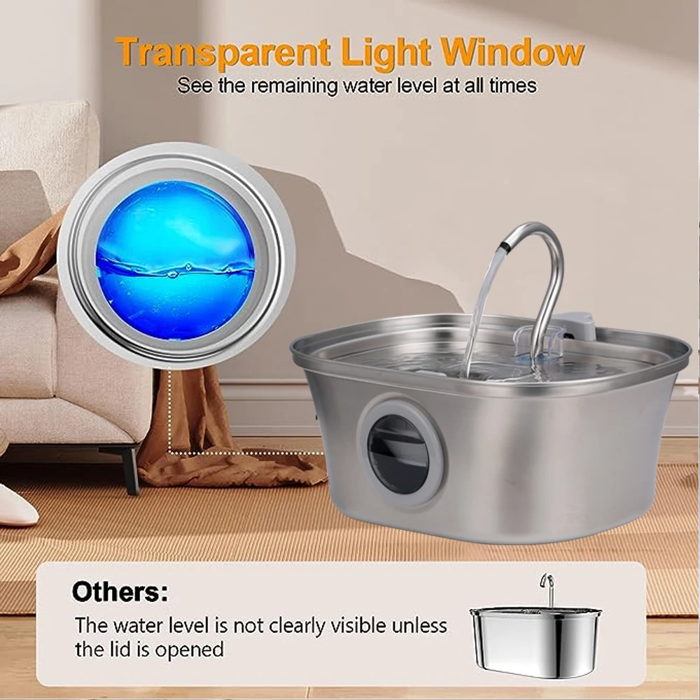 【Diseño único: ventana de nivel de agua y acero inoxidable】 Una ventana redonda transparente está diseñada en la fuente de agua para gatos de acero inoxidable, puede ver el nivel de agua de la fuente de agua para gatos sin abrir la fuente para gatos. La fuente para gatos está hecha de acero inoxidable 304 de alta calidad, que es resistente a la corrosión.