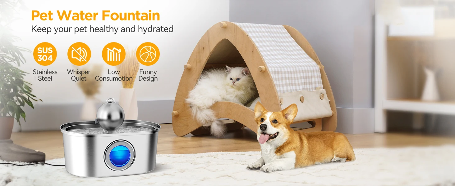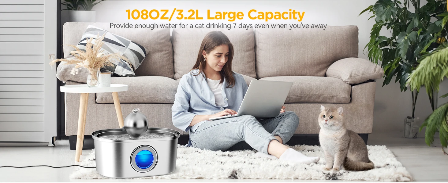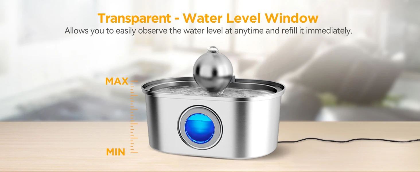 Una ventana redonda transparente está diseñada en la fuente de agua para gatos de acero inoxidable, puede ver el nivel de agua de la fuente de agua para gatos sin abrir la fuente para gatos.