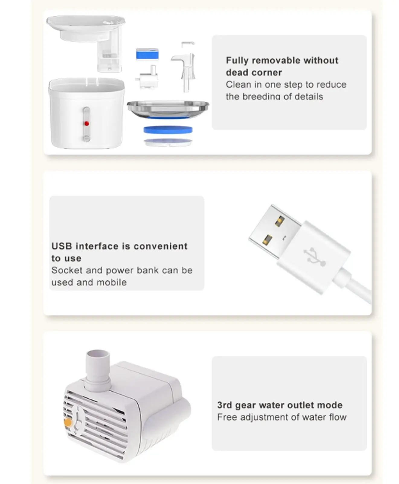 Dispensador de agua para mascotas de bajo ruido: el dispensador para mascotas utiliza una bomba ultrasilencioso, que produce un ruido de menos de 30 dB cuando funciona, especialmente de noche.Los gatos tendrán acceso a su agua en todas las horas del día, incluso los gatos tímidos deberían disfrutar bebiendo de esta fuente.