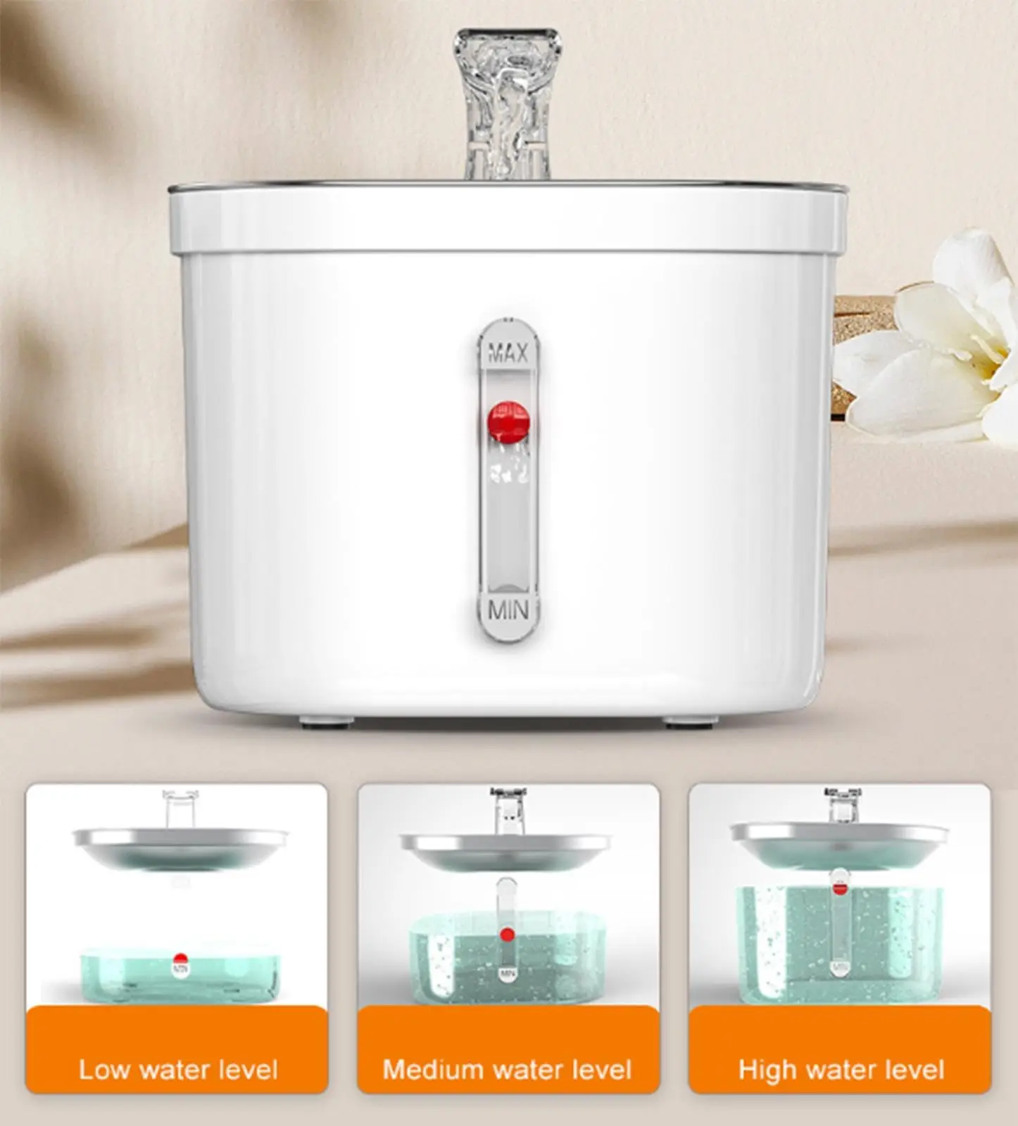 Diseño de aviso de cantidad de agua: la exclusiva boya roja le permite ver cuánta agua hay dentro.Al comprobar la altura de esta boya roja, es muy conveniente juzgar si necesita llenar o no la fuente de agua.