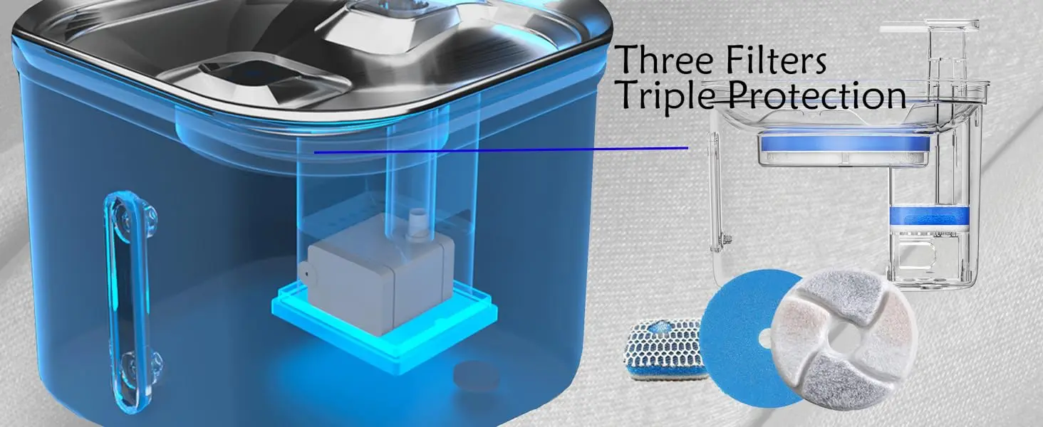 Nuestra fuente de agua para gatos de acero inoxidable tiene un sistema de triple filtración, prefiltrar primero una esponja, carbón activado y filtro de resina iónica, un filtro de esponja con red de algodón nuevamente, el sistema de filtración múltiple crea un proceso de circulación de agua impecable que garantiza que el agua de su mascota esté siempre pura y libre de impurezas nocivas.