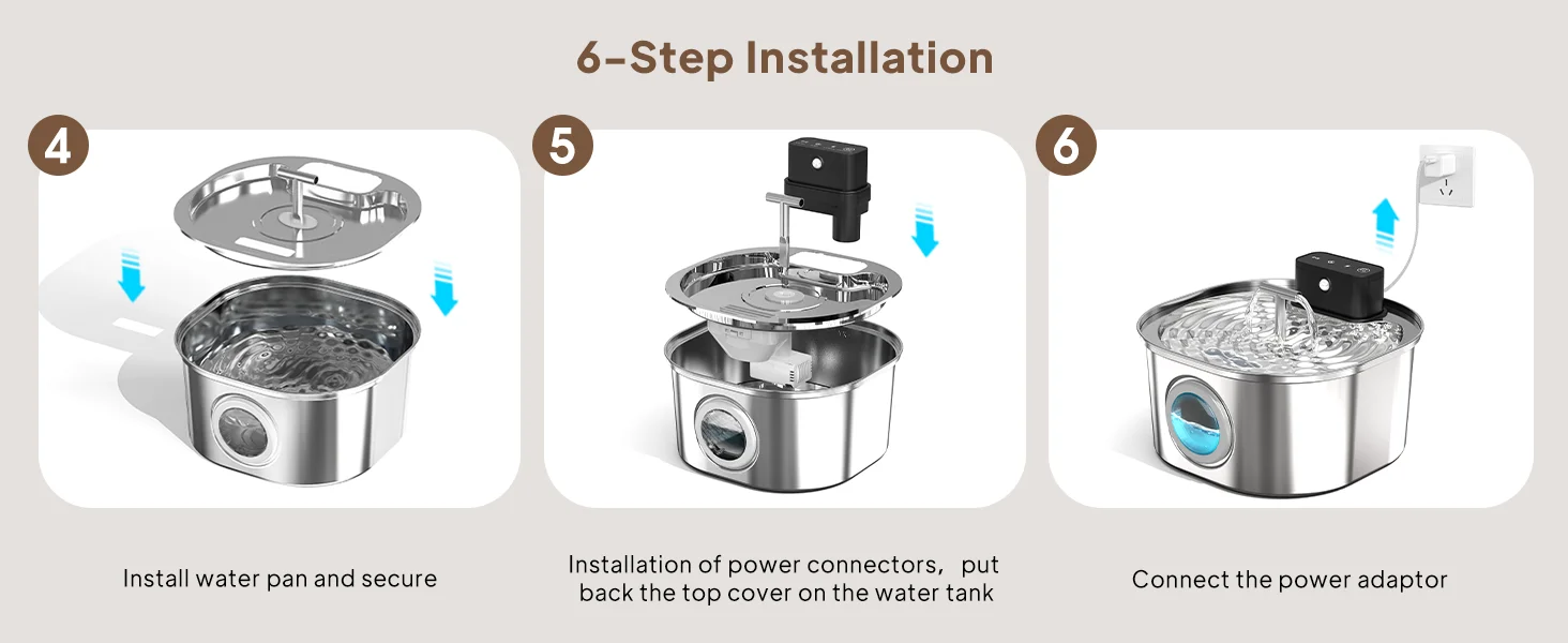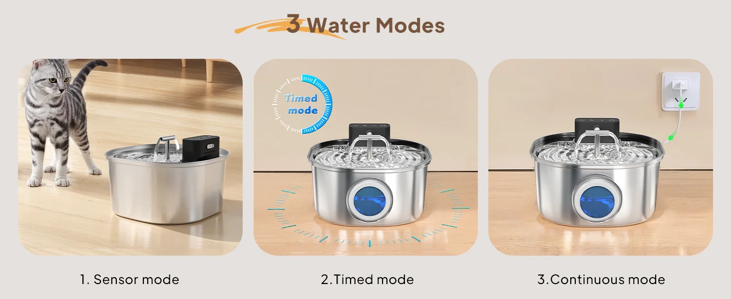 【Tres modos de suministro de agua】1 Modo de sensor: cuando se detecta una mascota, la fuente comienza a funcionar durante 30 segundos;2 Modo de sincronización: sigue funcionando durante 30 segundos y luego se detiene durante 10 minutos.3 Modo de energía: la fuente para mascotas sigue funcionando y nunca se detiene (el tipo C debe estar enchufado).En términos generales, el modo de inducción es la opción más adecuada para esta fuente de agua para mascotas.