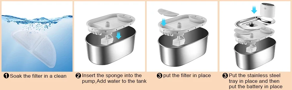 Enjoy Every Sip of Fresh Water - The 5-level filtration system continuously provides fresh and healthy water to your pets. 1.Non-woven fabric filtering hair & detritus.2.Activated carbon filtering micro particles.3.lon exchange resin effectively softens hard water.4.Tourmaline super sterilization.5. High-density sponge further filters debris and prevents blockages while taking the pump lifespan to the next level.