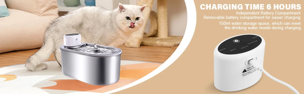 Powerful Battery Life - Built in 4000mAh large rechargeable battery instead of running on disposable batteries, which means money-saving, environmentally friendly, and hassle-free.Battery operated pet water fountain inside will keep your pets well-hydrated even during power cuts or when you take short trips.