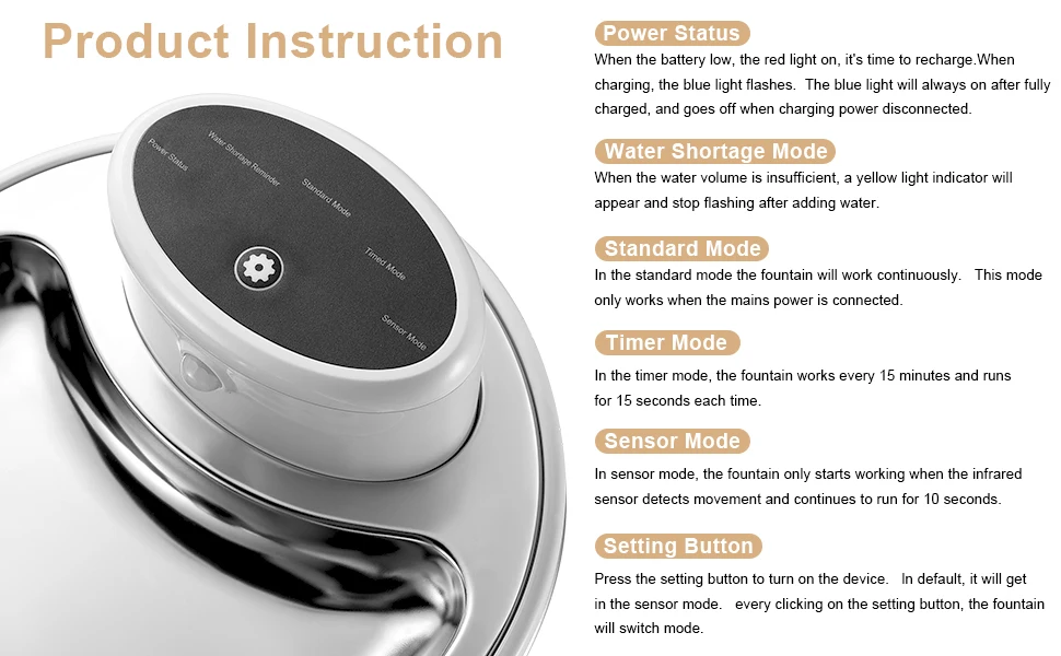 3 modos de flujo de agua: nuestra fuente de agua inalámbrica para gatos ofrece 3 opciones de modo para diferentes necesidades. Modo 1-Modo del sensor: inicia el funcionamiento automático durante 10s cuando se detecta movimiento. Modo 2-Modo de temporizador: funciona cada 15 minutos durante 15 segundos cada vez. Modo 3-Modo estándar: seguir funcionando (solo disponible cuando se conecta a la red eléctrica).