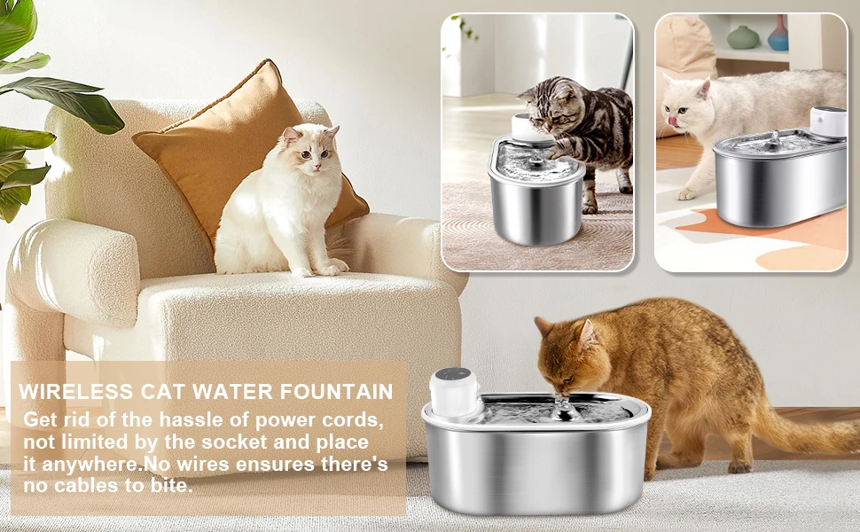 Fuente de agua inalámbrica para gatos que funciona con pilas: mejore las precauciones de seguridad de la familia, Diga adiós a los cables enredados y evite que sus mascotas los masticen. Sus mascotas ahora pueden disfrutar de agua fresca y limpia en cualquier lugar que quieran. Configure una fuente de agua de acero inoxidable donde sus mascotas lo necesiten: su cocina, dormitorio, balcón, patio o más.