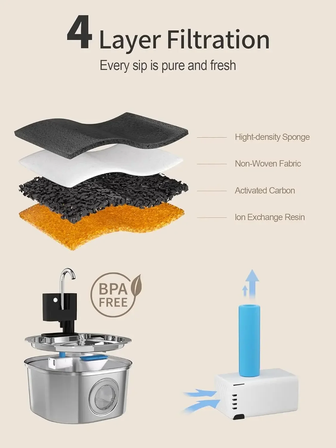 【Sistema de filtración cuádruple avanzado】Nuestra fuente de agua inalámbrica para mascotas cuenta con un sistema de filtración vertical diseñado para proporcionar constantemente una hidratación limpia, fresca y saludable para su mascota.Este avanzado sistema de cuatro capas elimina eficazmente las impurezas y los olores, suaviza el agua y mejora su sabor.Al reducir el riesgo de problemas urinarios y gastrointestinales, garantiza que su amigo peludo disfrute de agua pura y refrescante cada vez que beba.