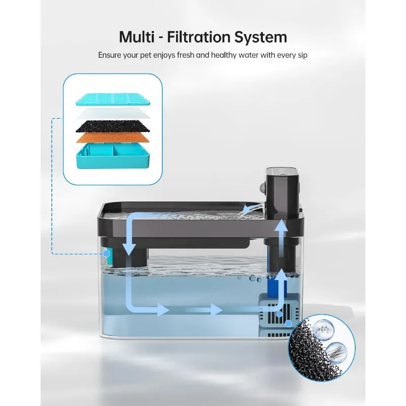 Sistema de filtración múltiple: esta fuente de agua inalámbrica para gatos tiene un sistema de filtración multicapa que garantiza sorbos frescos y limpios.Los filtros, hechos de tela no tejida, carbón doble activado y resina de intercambio iónico, filtran impurezas, elimina olores y purifican el agua.(Reemplace el filtro cada 1-3 semanas para su salud).