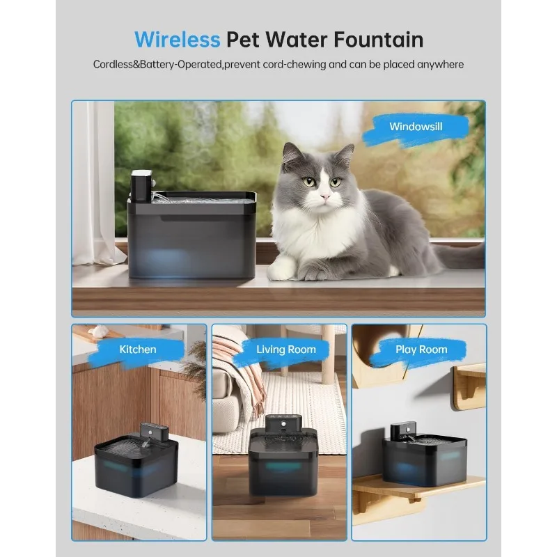Fuente de agua inalámbrica para mascotas que funciona con baterías: alimentada por una batería recargable incorporada, esta fuente de agua inalámbrica para mascotas ofrece una ubicación flexible.Puedes ponerlo en la cocina, el dormitorio, el balcón, el patio, en el suelo, en la mesa, en el alféizar de la ventana o en cualquier otro lugar que guste tu mascota.Su mascota puede disfrutar de agua fresca que fluye en cualquier lugar sin preocuparse por masticar el alambre o las limitaciones del alambre.