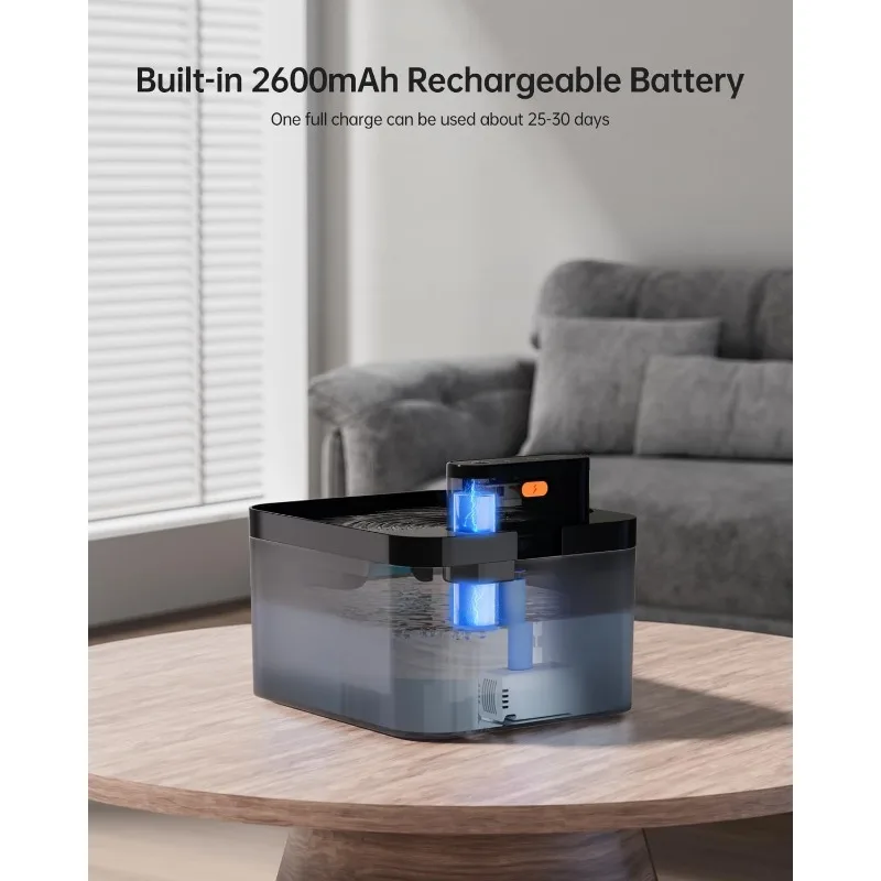 Suficientes duración y capacidad de la batería: la fuente de agua para gatos de interior tiene una batería recargable de 2600 mAh, que dura hasta 25 días.El tanque de 2,2 litros del dispensador de agua para mascotas satisface las necesidades de agua de su gato o perro durante 5 a 9 días.Bueno para mascotas pequeñas y medianas.Sin recargas frecuentes.No te preocupes cuando estás fuera de una semana.