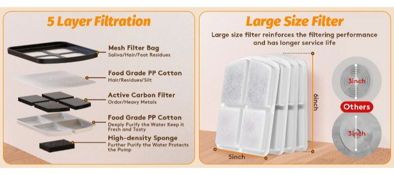 Filtración de 5 capas y filtro de gran tamaño: la filtración de 3 capas de carbohidratos activados de coco absorbe el orden, puede absorber el orden y filtrar mejor los metales pesados.Este bebedero para perros agregó una bolsa de filtro de malla y puede recolectar eficazmente la saliva, el pelo y los escombros.Finalmente, la esponja de alta densidad purifica aún más el agua y protege la bomba. La fuente utiliza un filtro de gran tamaño (5 pulgadas de diámetro, no solo 3 pulgadas como la mayoría), que refuerza el rendimiento de filtrado y tiene una vida útil más larga.