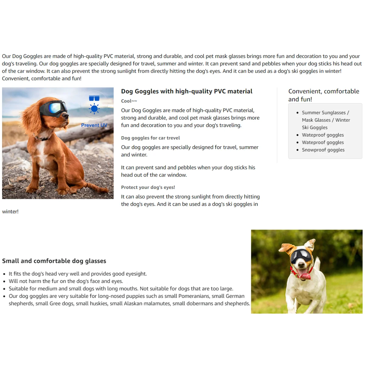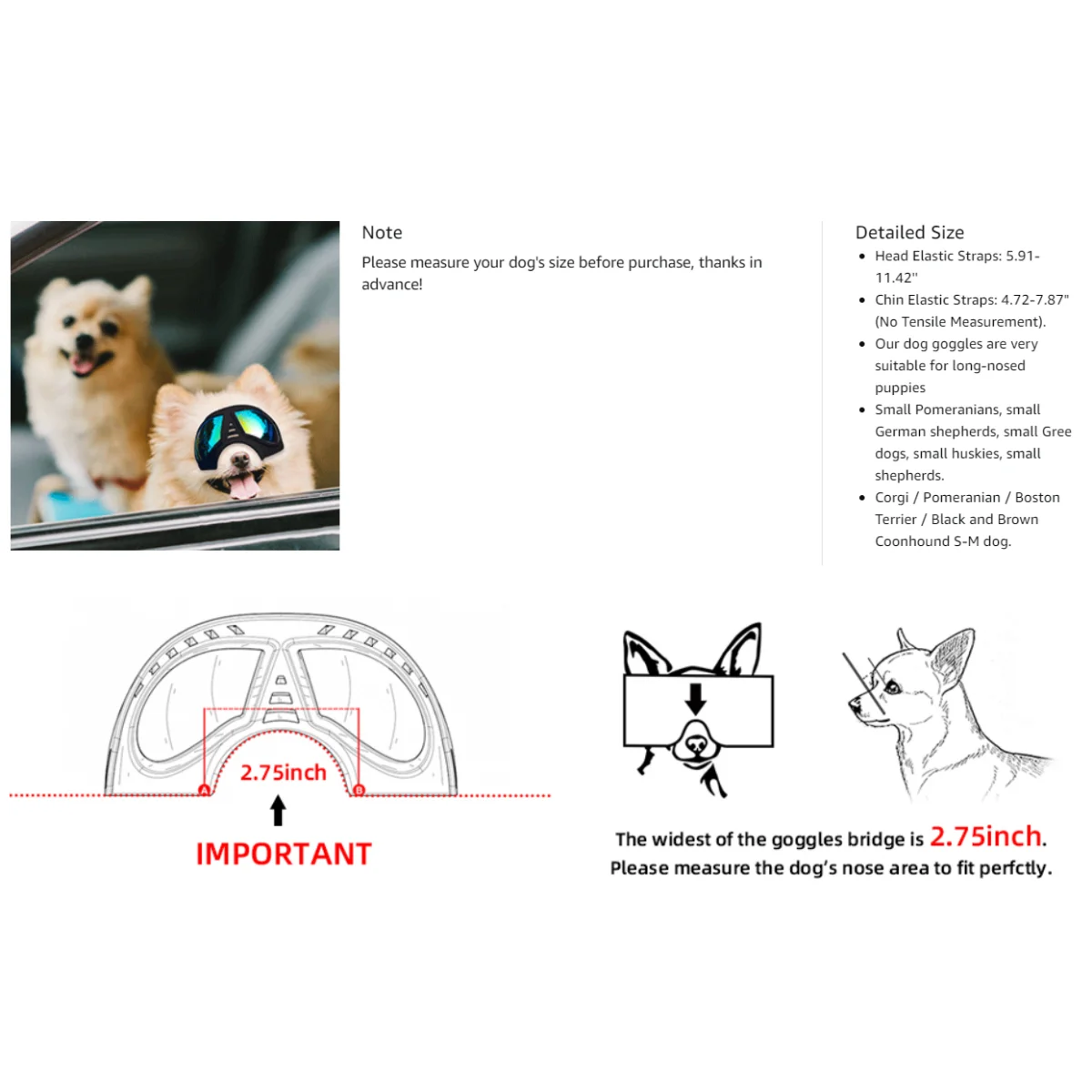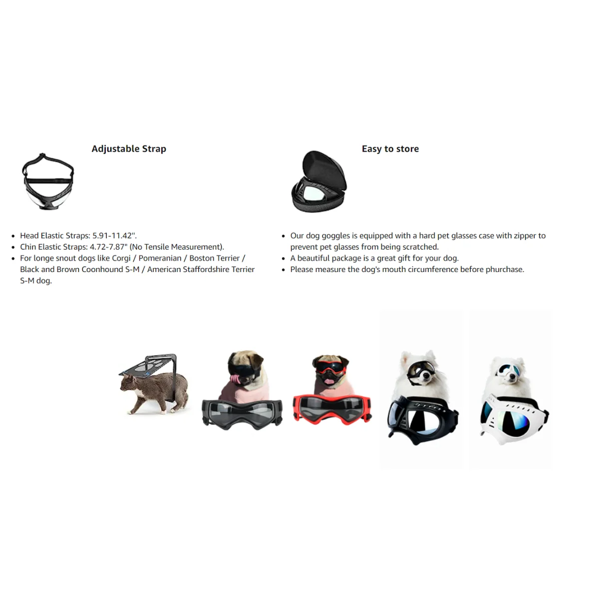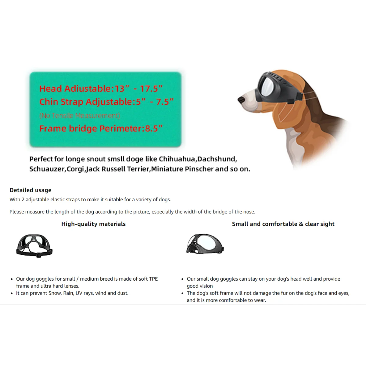 Gafas para perros pequeñas y cómodas: se ajustan bien a la cabeza del perro y proporcionan una buena visión. El marco suave no dañará la piel de la cara y los ojos del perro. Adecuado para perros pequeños/medianos de boca larga.