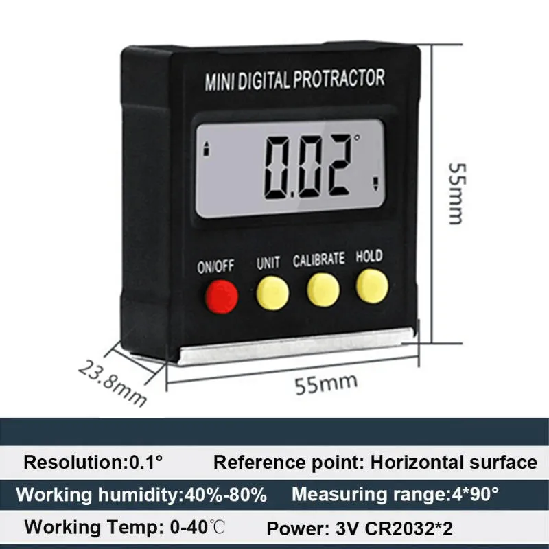 Puede instalar la batería fácilmente y no necesita destornillador.Con 2 pilas AAA, el medidor de ángulo digital funciona de 50 horas de forma promedio.*Apagado automático después de 5 minutos.