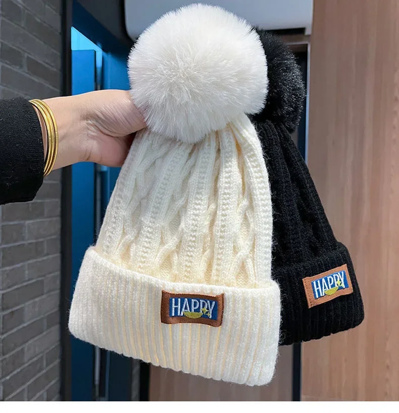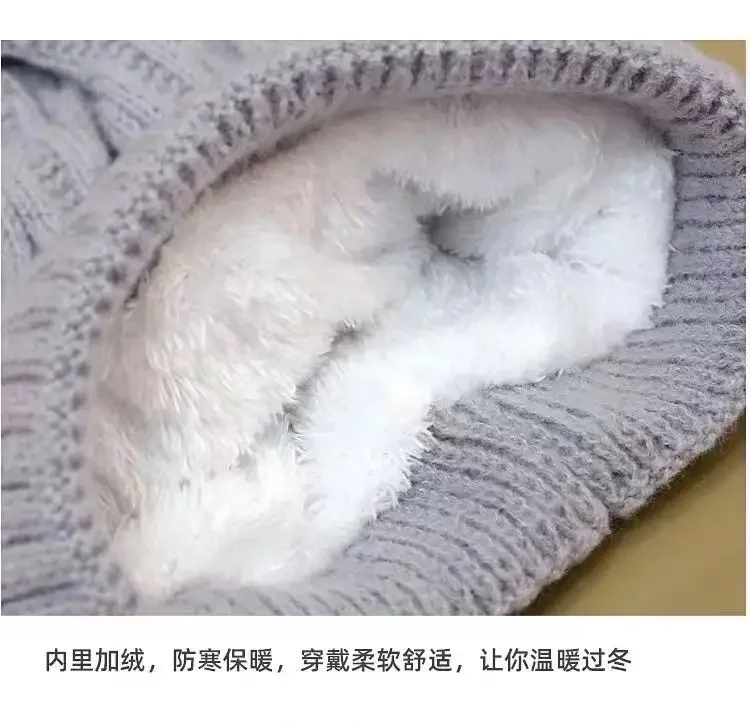 Gorro de lana de terciopelo para invierno, gorro de punto grueso y cálido para mujer, gorro de bola de pelo con cierre de cabeza grande, gorro de bola blanco