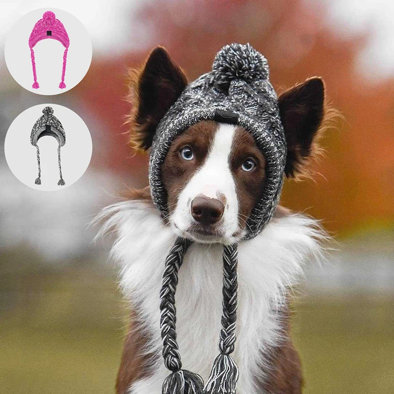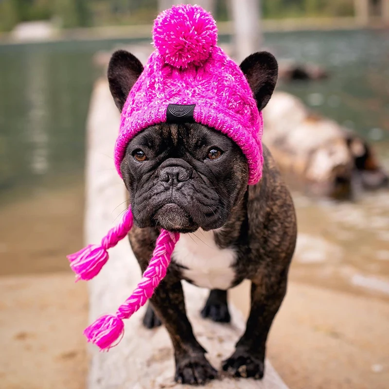 Gorro de punto suave a prueba de viento con agujeros para las orejas, bola esponjosa para perros y gatos, Bulldog francés, suministros para cachorros, cálido, invierno