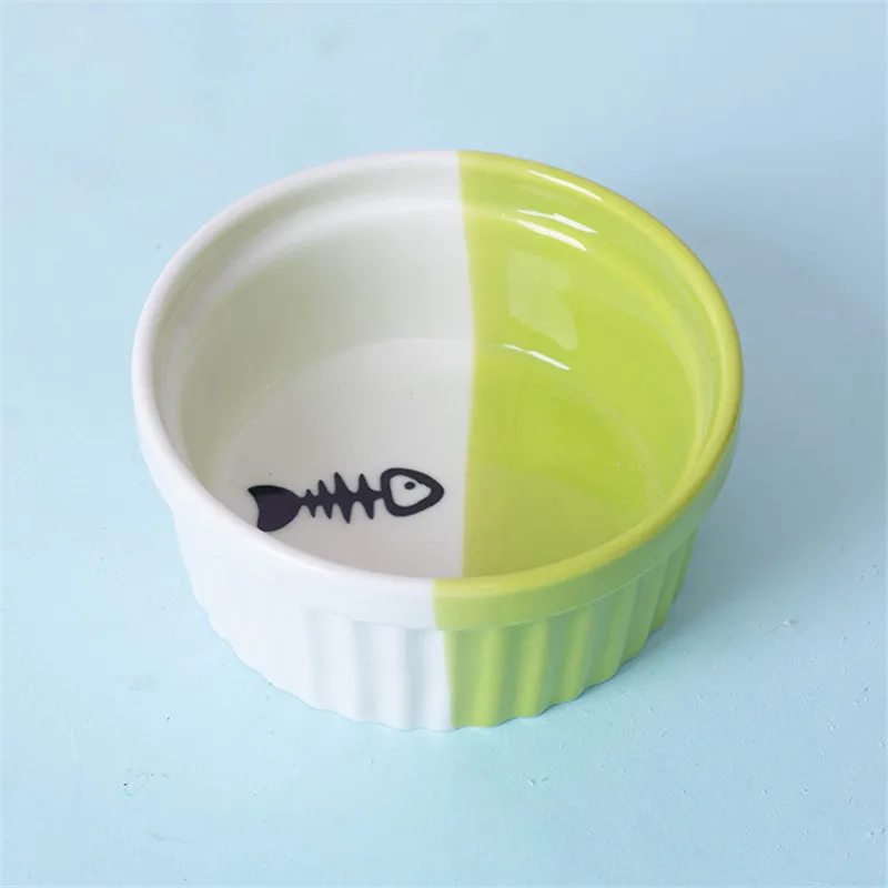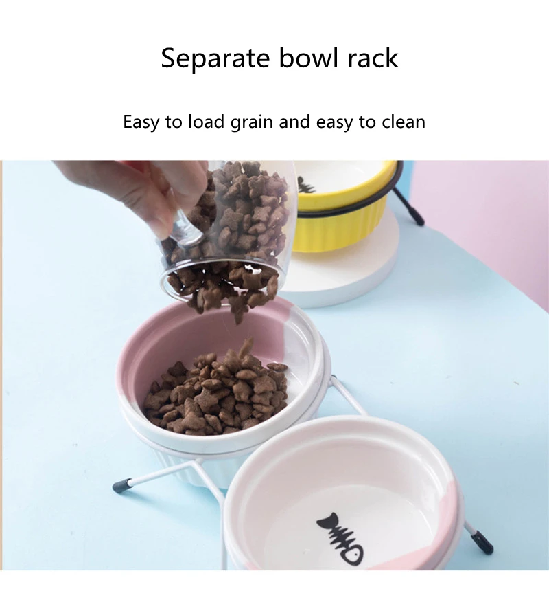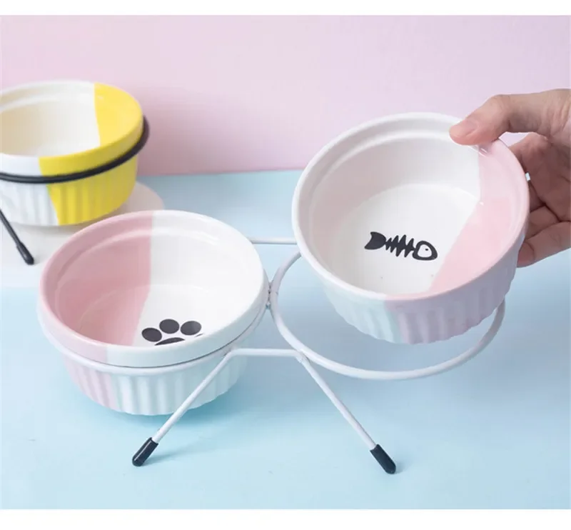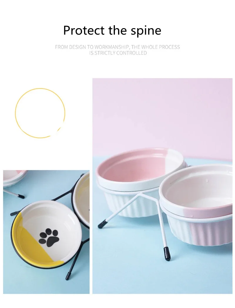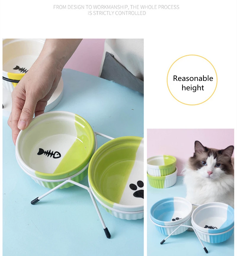 Gran oferta, cuenco de cerámica para perro con boca oblicua de pie alto, diseño de dibujos animados a la moda, alimentador para mascotas, cuenco para gato de dos tonos de Color, suministros para mascotas
