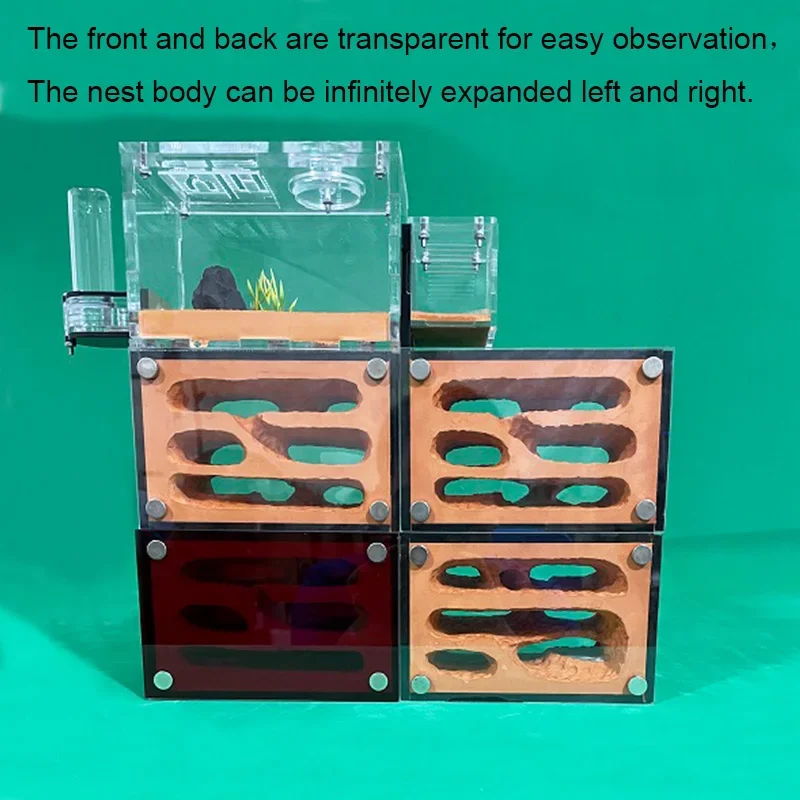 Característica: 1. La estructura del nido adopta el diseño de vidrio acrílico transparente en la parte delantera y trasera, que puede observar fácilmente los hábitos de vida de las hormigas en una vista panorámica. 2. Los lados izquierdo y derecho del cuerpo del nido y los lados superior e inferior pueden expandirse entre sí, y el espacio del cuerpo del nido se puede ampliar indefinidamente 3. El tipo acrílico engrosado puede evitar que las hormigas escapen y dañen el nido de hormigas, y la calidad de la granja de hormigas es mejor. 4. La granja de hormigas está hecha de hormigón de yeso y materiales de arcilla amarilla. El yeso tiene un buen efecto hidratante, y el hormigón es más ecológico y más cercano al entorno vivo de las hormigas. 5. Hay en el nido una gran torre de agua hidratante para mantener la humedad en el área del nido, para que las hormigas puedan reproducirse y poner huevos mejor. 6. El lado derecho del nido está equipado con un puerto de inyección de agua + sala de observación del nivel del agua para observar mejor el nivel del agua y reponerla a tiempo. 7. Los imanes se instalan en la cubierta de vidrio del área del nido para facilitar la observación de las hormigas y limpiar el área del nido. 8. El parasol rojo hará que las hormigas se sientan seguras y cómodas 9. Adecuado para todo tipo de cría de hormigas 10. Hay 4 Dispositivos antideslizantes en la parte inferior del producto. 11. Se puede conectar al área de basura externa y al dispensador de agua