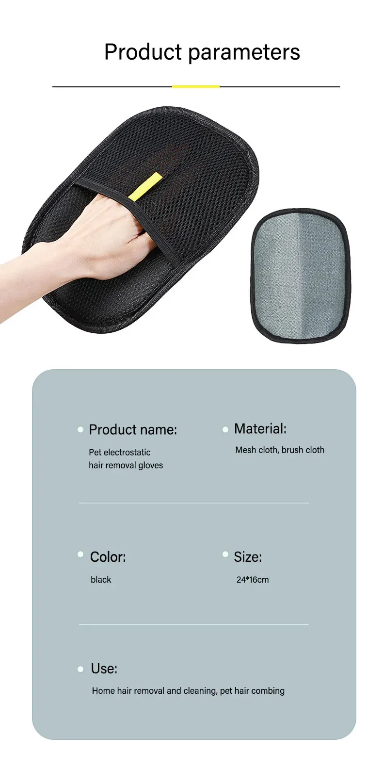 Guantes de aseo para mascotas, cepillo estático para quitar el polvo, cepillo para eliminar el pelo de perros y gatos del sofá, alfombras, ropa, suministros de herramientas Descripción del producto Nombre: Guantes de depilación estática para mascotas Material: tela de malla, tela cepillada Color negro Tamaño: 24*16cm Uso: Depilación y limpieza del hogar, cuidado de mascotas. Características: Depilación y quitamanchas, cepillado bidireccional, lavable, duradero.
