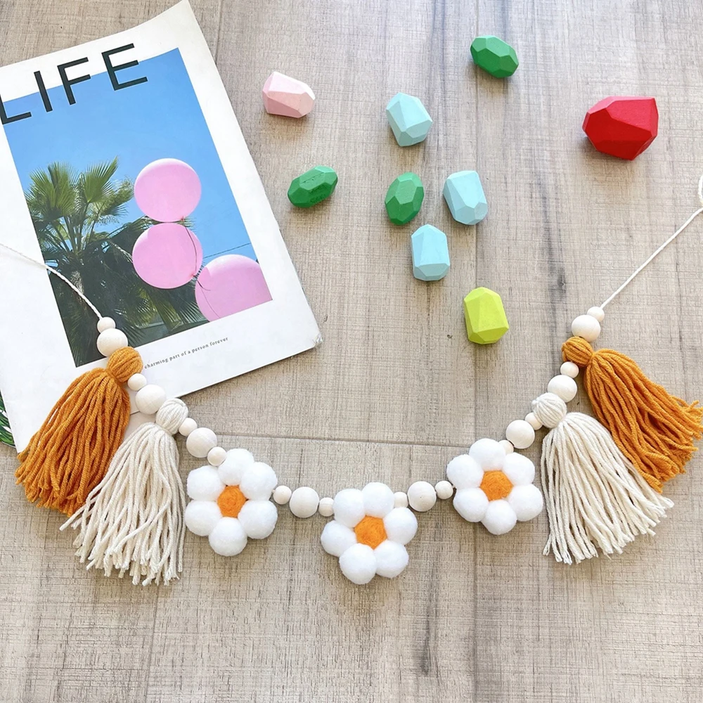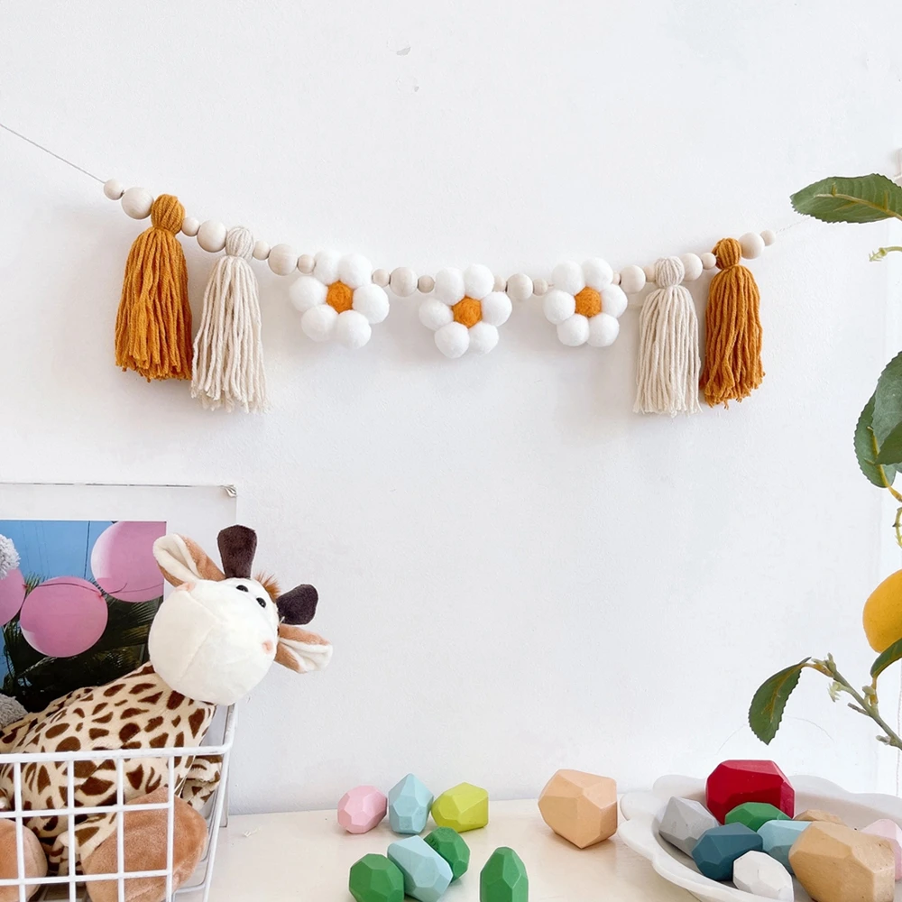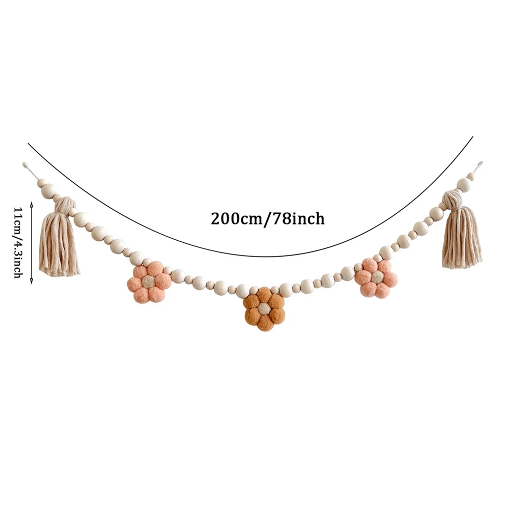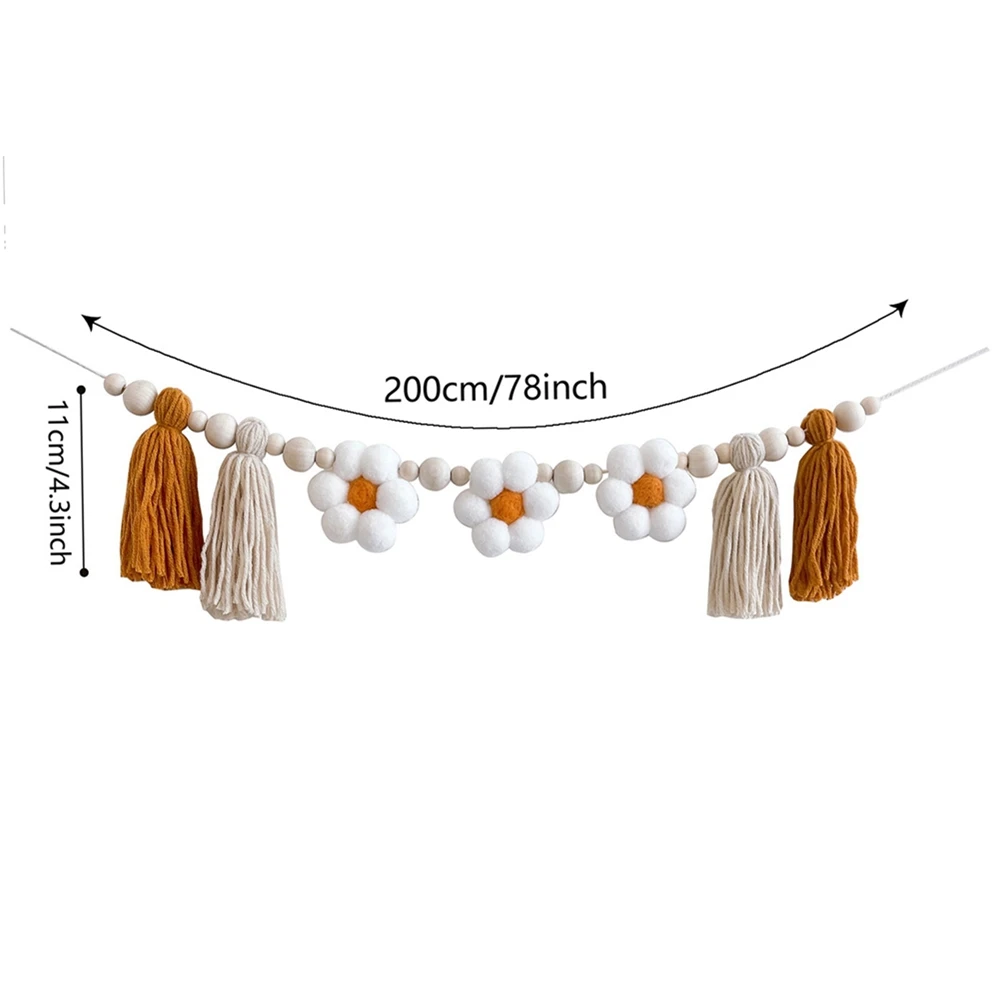 Materiales de alta calidad: cuidadosamente elaborados y ensamblados a mano, la guirnalda de margaritas está hecha de fieltro y madera de alta calidad. Midiendo 78,7 pulgadas de largo, incluye tres flores de fieltro, dos borlas y cuentas de madera de diferentes tamaños.