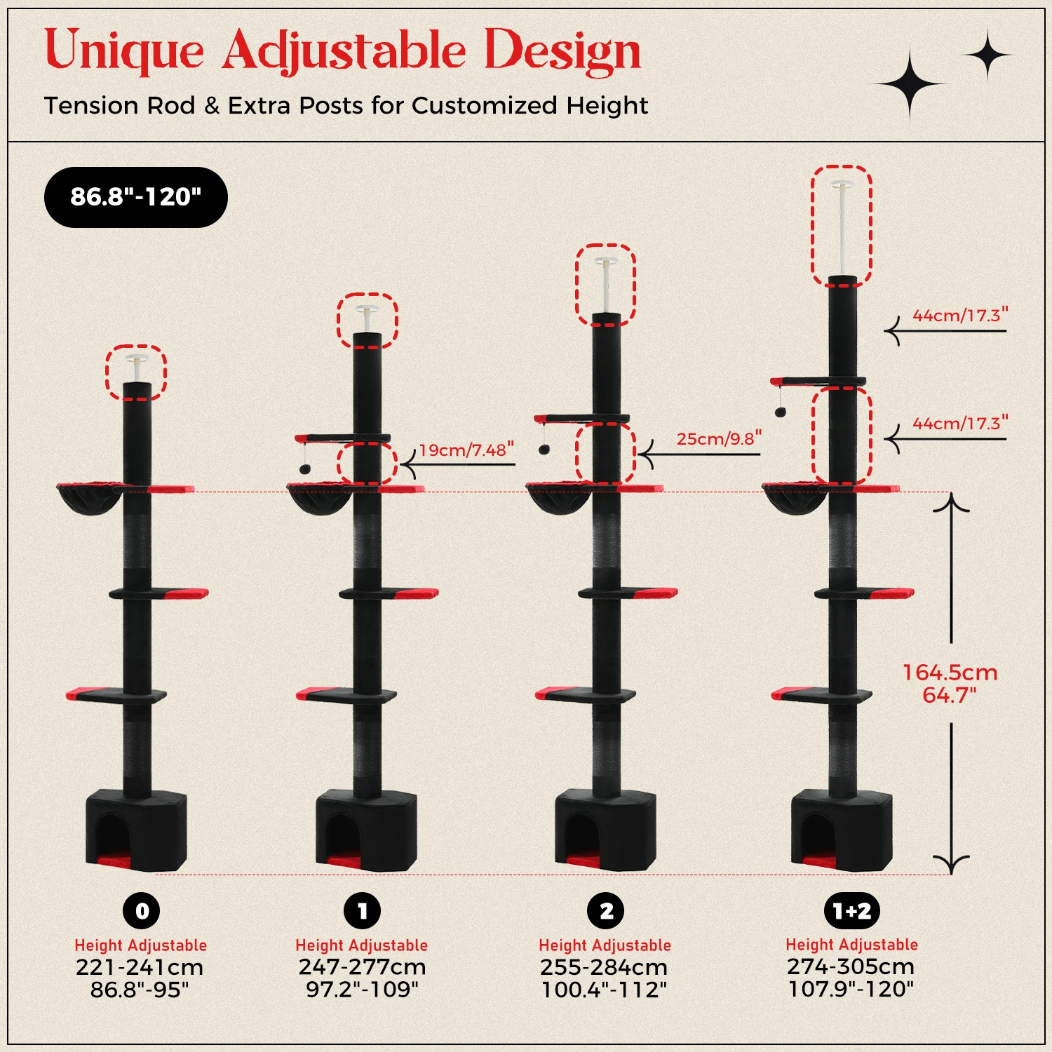 1. Árbol para gatos con altura ajustable: todo el árbol para gatos consta de plataformas cubiertas de 5 niveles, la distancia desde cada 2 plataformas es de 17,9 pulgadas, la varilla de tensión en la parte superior se puede ajustar a una altura preferida de alta a baja (94-108 pulgadas) para acomodar el techo de la habitación. No se preocupe por que su felino esté tan alto porque este árbol para gatos tiene un resorte ajustable en la parte superior, lo que lo mantiene estable entre sus pisos y el techo, para una caída libre, ambiente estable.