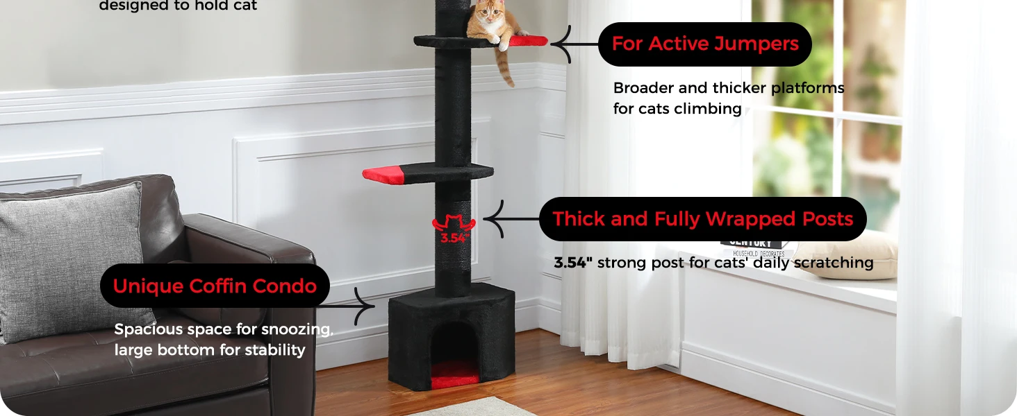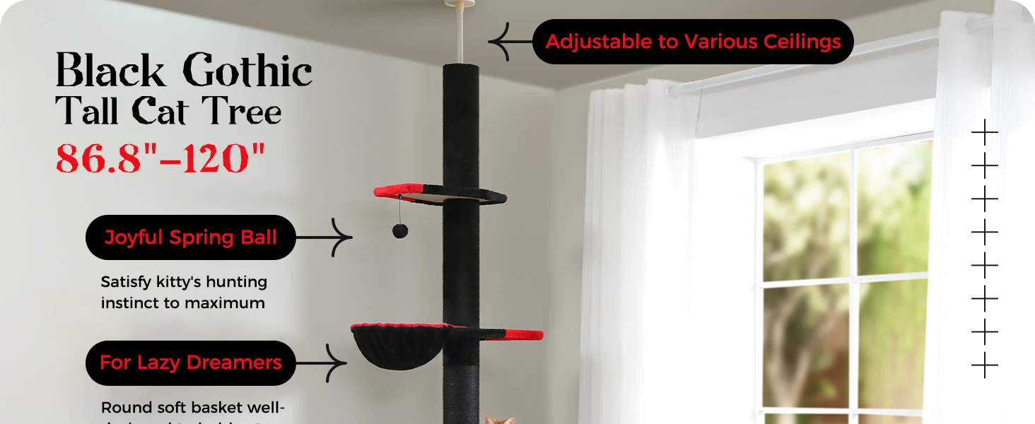 3. Diseñado para el instinto natural de los gatos: a los gatos les gusta trepar a lugares altos de forma natural, la altura de este árbol para gatos se expande hasta el techo, los gatos se sentirán felices de llegar al punto más alto de la casa; Los gatos nacen para ser cazadores, Los postes de rascado cubiertos de sisal y la bola colgante les permitirán afilar sus garras y practicar sus habilidades de caza. Cuando llegue la hora de descanso, los gatitos pueden descansar, posarse y dormir la siesta en las plataformas de felpa y la hamaca.