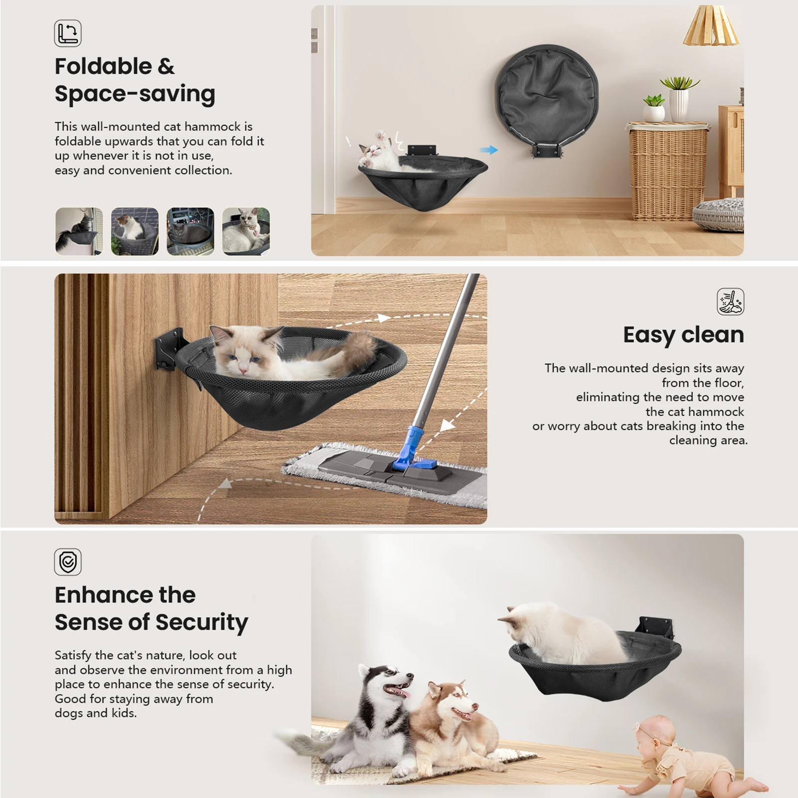 Esta hamaca para gatos montada en la pared se puede instalar en un armario o en la pared sin ocupar espacio en el suelo.Es plegable hacia arriba para que puedas plegarlo cuando no esté en uso, recogida fácil y cómoda.Cuando los gatos quieren subirse a él para tomar una siesta, sólo necesitas dejarlo.Puede mejorar enormemente la utilización del espacio interior.