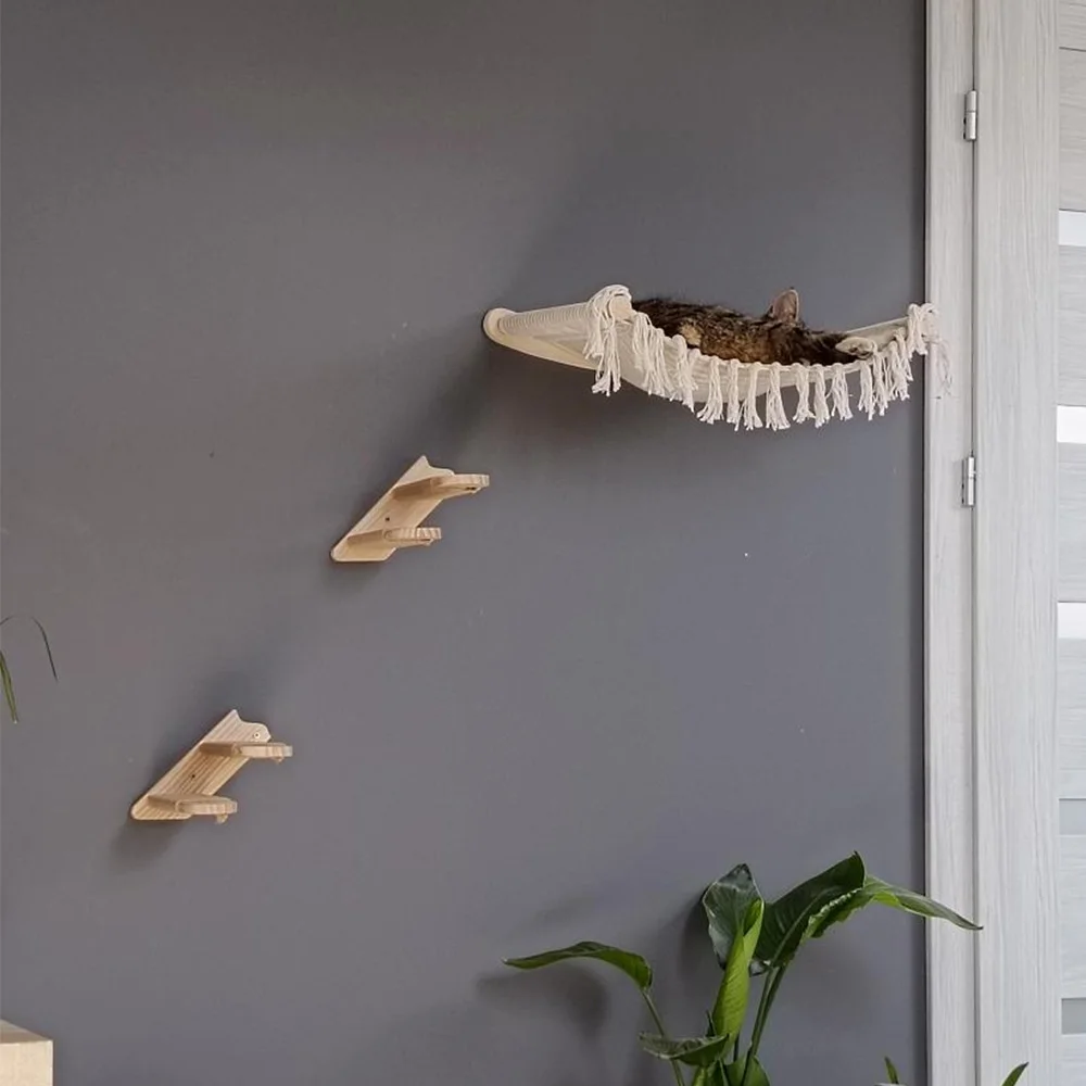 El marco de madera es resistente y duradero, finamente pulido con bordes lisos y sin rebabas, lo que garantiza la estabilidad estructural y evita rayar a los gatos o dañar las paredes.El método de instalación es sencillo y se puede colgar fácilmente en la pared sin ocupar espacio en el suelo, abriendo una zona de descanso exclusiva para gatos a gran altitud, que está en línea con su naturaleza de altura amorosa y disfrute de la tranquilidad.
