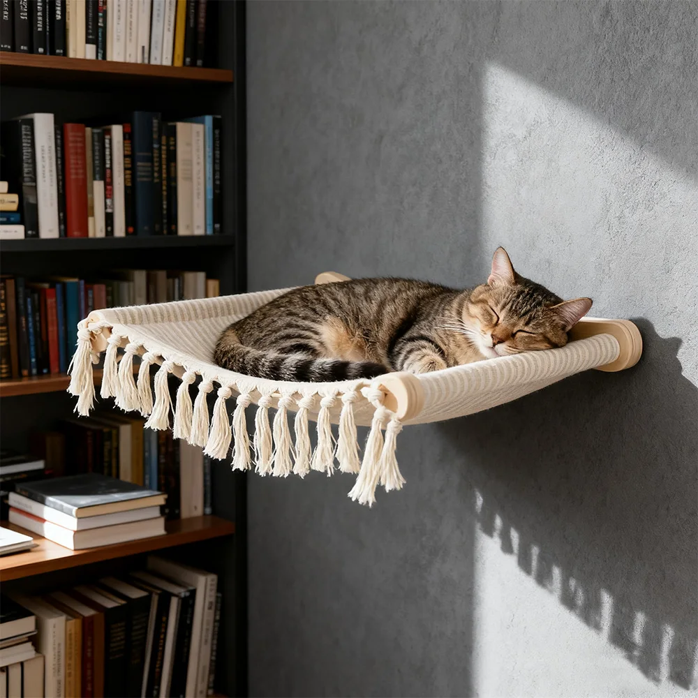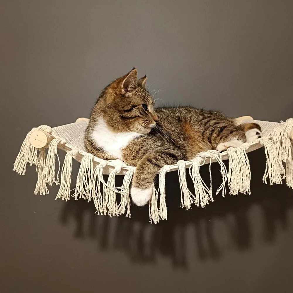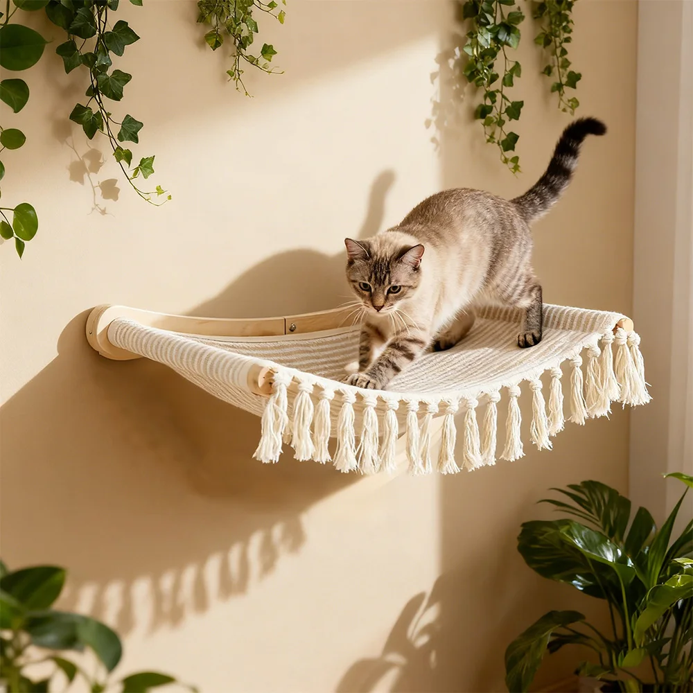 Esta hamaca para gatos montada en la pared está diseñada específicamente para satisfacer las necesidades de descanso de los gatos y es un excelente artículo para mejorar la calidad de vida de sus queridos mascotas.Utiliza una tela tejida suave y agradable para la piel para crear la superficie de la cama, que tiene un tacto cómodo y puede brindar un apoyo suave a los gatos, haciéndolos sentir relajados cuando están acostados.El borde de la cama está cuidadosamente decorado con exquisitas borlas, lo que agrega una estética de estilo bohemio que puede combinarse inteligentemente con varios estilos de decoración de interiores, convirtiéndose en un paisaje único en el entorno del hogar.