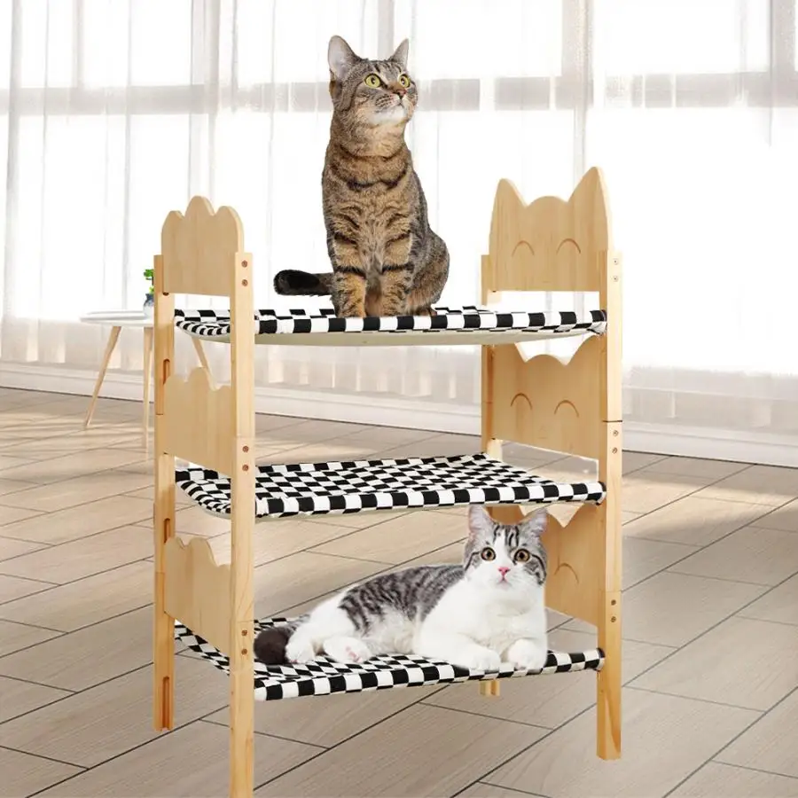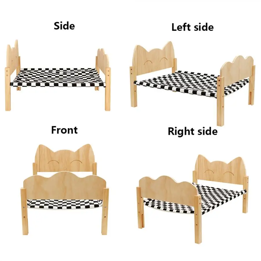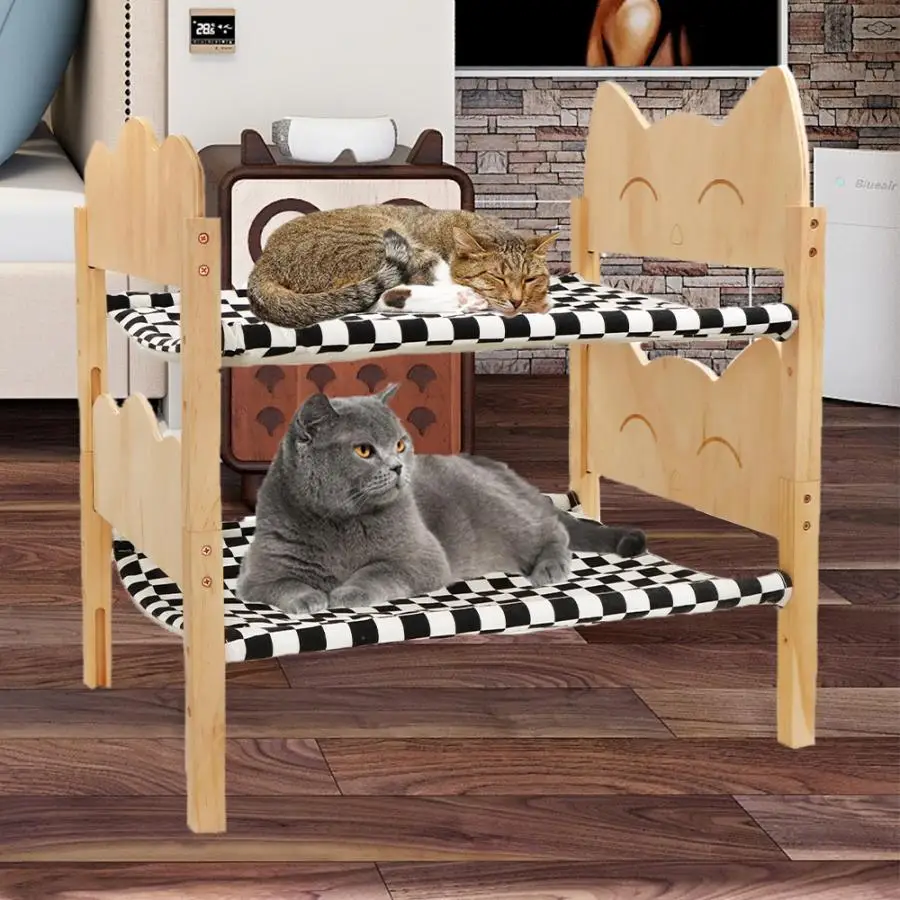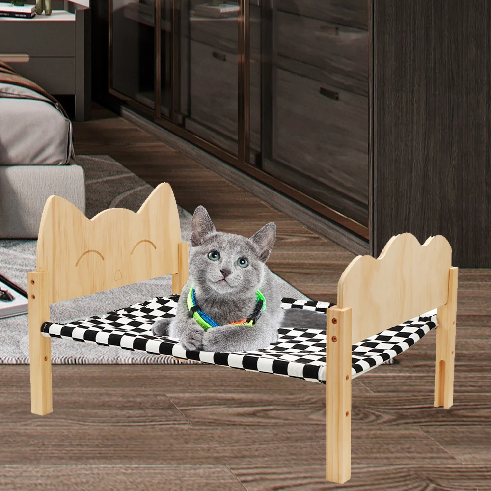 Cama de madera para mascotas · El tamaño ideal: el tamaño de la cama para gatos es de aproximadamente 54,5 cm x 40cm x 35cm. Los gatos y perros de tamaño mediano pueden dormir cómodamente en la cama. · Diseño estable-estructuralmente estable, los gatos y los perros no temblarán al voltear una cama elevada para gatos, asegurando que puedan dormir tranquilamente. · Lavable y transpirable-La tela suave de la hamaca para gatos se puede limpiar y secar fácilmente, lavable a máquina, asegurando un ambiente limpio y refrescante para gatos y cachorros. Este material transpirable también puede mantenerse seco y reducir las bacterias en climas cálidos. · Adecuado para hogares con varios gatos: Si hay varios gatos, se pueden apilar para formar una cama doble o triple.