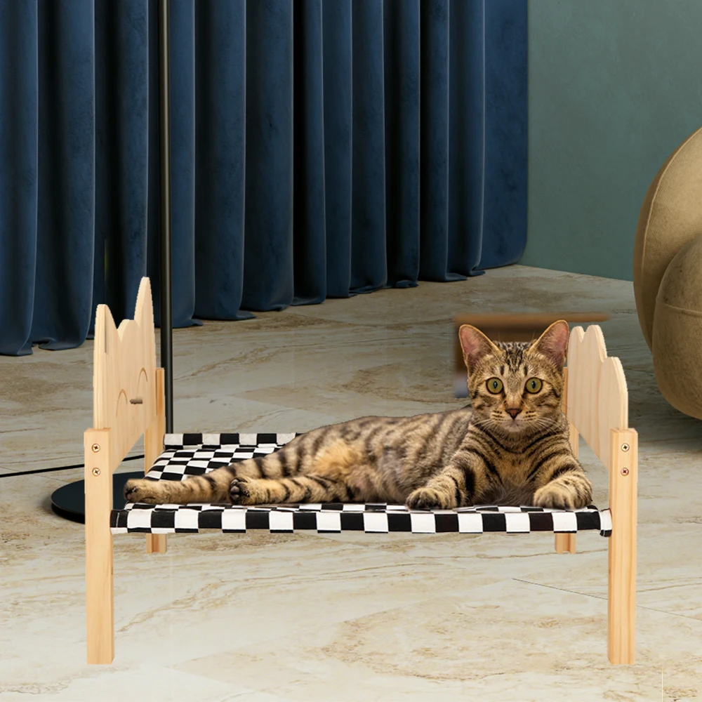 Cama de madera para mascotas · El tamaño ideal: el tamaño de la cama para gatos es de aproximadamente 54,5 cm x 40cm x 35cm. Los gatos y perros de tamaño mediano pueden dormir cómodamente en la cama. · Diseño estable-estructuralmente estable, los gatos y los perros no temblarán al voltear una cama elevada para gatos, asegurando que puedan dormir tranquilamente. · Lavable y transpirable-La tela suave de la hamaca para gatos se puede limpiar y secar fácilmente, lavable a máquina, asegurando un ambiente limpio y refrescante para gatos y cachorros. Este material transpirable también puede mantenerse seco y reducir las bacterias en climas cálidos. · Adecuado para hogares con varios gatos: Si hay varios gatos, se pueden apilar para formar una cama doble o triple.