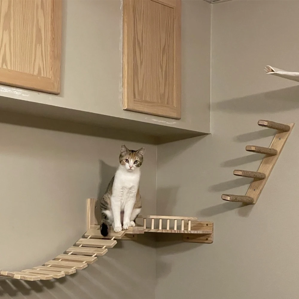 Los estantes de pared para gatos satisfacen el hábito de los gatos de escalar, aumentando el ejercicio y reduciendo la posibilidad de obesidad, lo que es bueno para la salud. Además, le da a los gatos espacio para trepar y evitar estropear el hogar.
