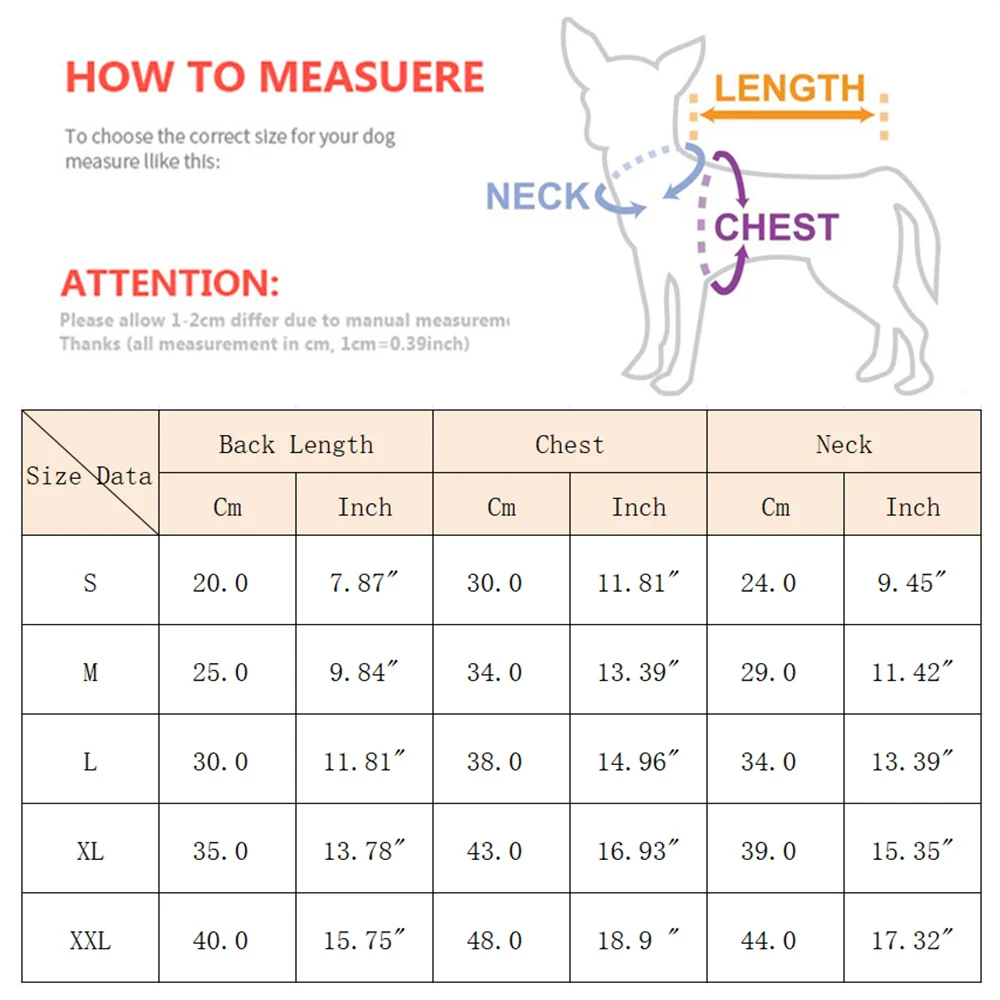 1. Por favor, compruebe las medidas de su mascota para asegurarse de que la ropa se ajuste a las mascotas antes de realizar el pedido (1 pulgada=2,54 cm)