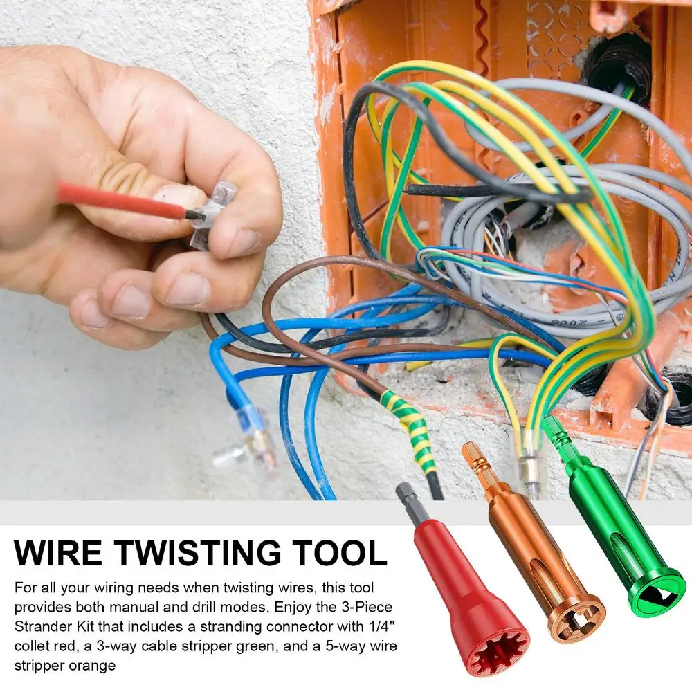 Kit Strander de 1,3 piezas: para todas sus necesidades de cableado al torcer cables, esta herramienta es perfecta para modos manuales y de perforación. Viene con un kit de trenzado de 3 piezas que incluye un conector de trenzado rojo con pinza de 1/4 ", un Pelacables verde de 3 vías y un Pelacables naranja de 5 vías. Simplifique sus proyectos de cableado ahora.