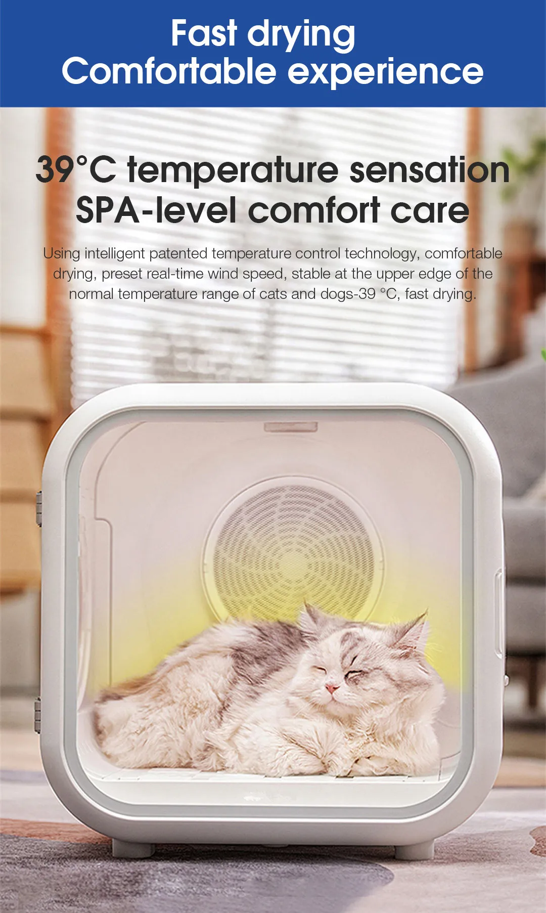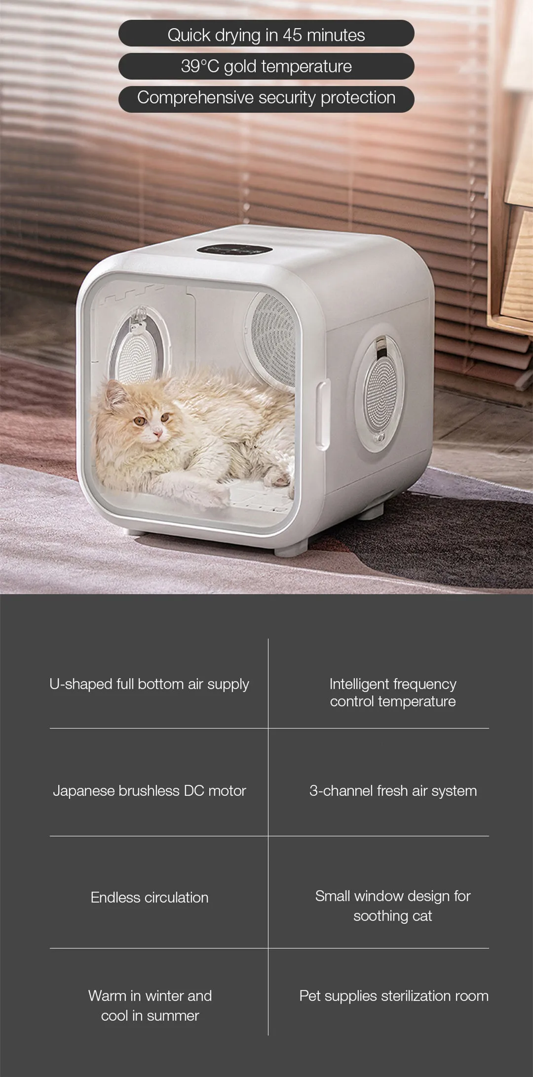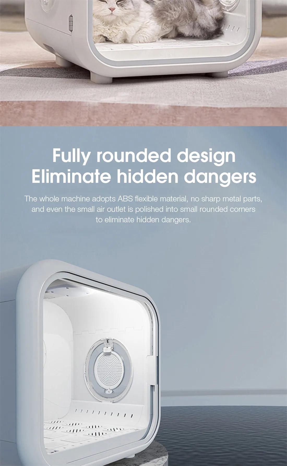 ● De acuerdo con el hábito de la mascota tumbarse boca abajo, esta caja de secado adopta un diseño de suministro de aire de fondo completo.El flujo de aire cálido llega al abdomen, pantorrilla y otras partes de la mascota que son difíciles de secar, secando rápidamente sin dejar callejones sin salida.