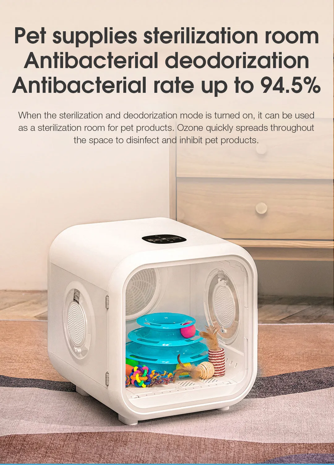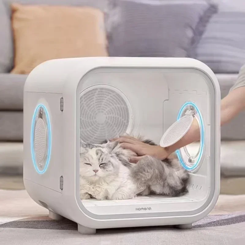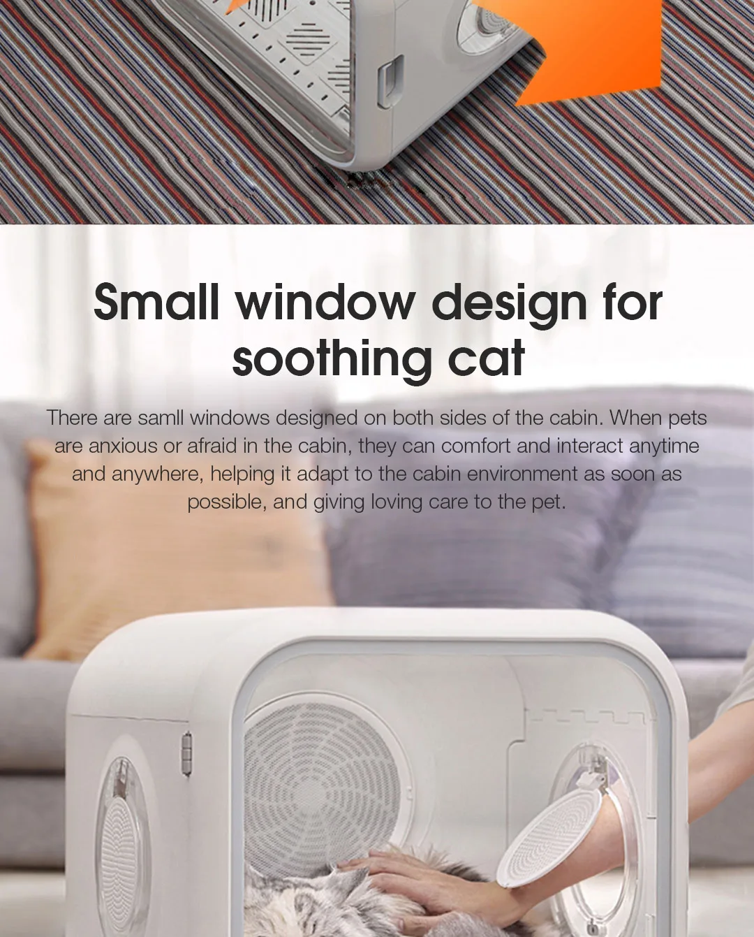 ● De acuerdo con el hábito de la mascota tumbarse boca abajo, esta caja de secado adopta un diseño de suministro de aire de fondo completo.El flujo de aire cálido llega al abdomen, pantorrilla y otras partes de la mascota que son difíciles de secar, secando rápidamente sin dejar callejones sin salida.