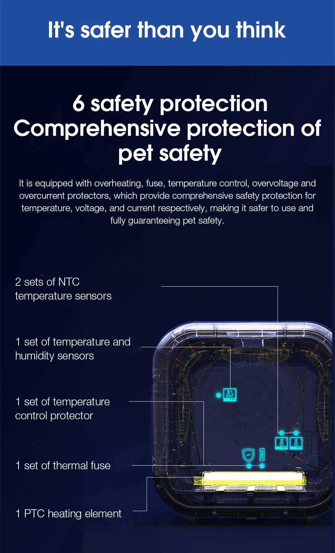 ● Equipado con protectores de sobrecalentamiento, fusión, control de temperatura, sobretensión y sobrecorriente, protección de seguridad integral para garantizar la seguridad de las mascotas.