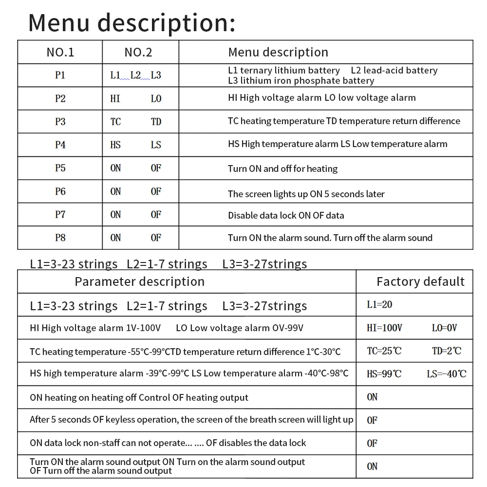 2. Modo de trabajo; 3 tipos, batería de litio ternaria L1 medida serie 03-S a serie 23-S (Memoria de apagado), batería de plomo-ácido L2 medida: DC12V, 24V, 36V, 48V, 60V, 72V, 84V (Memoria de apagado)