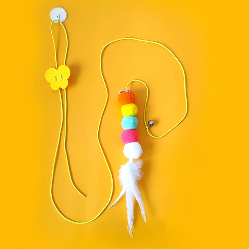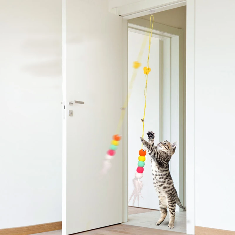 2.Diseño: juguete para gatos oscilante, este juguete para gatos se puede colgar en la parte superior del marco de la puerta con un gancho adhesivo que no deja marcas, ajusta la longitud de la cuerda ajustando la hebilla, deja que el gato juegue solo, la cuerda es elástica, el bádminton oscilante atrae la atención del gato. Hay una pequeña campana en la cuerda, que suena de un vistazo, lo que atrae al propietario a interactuar con el gato.