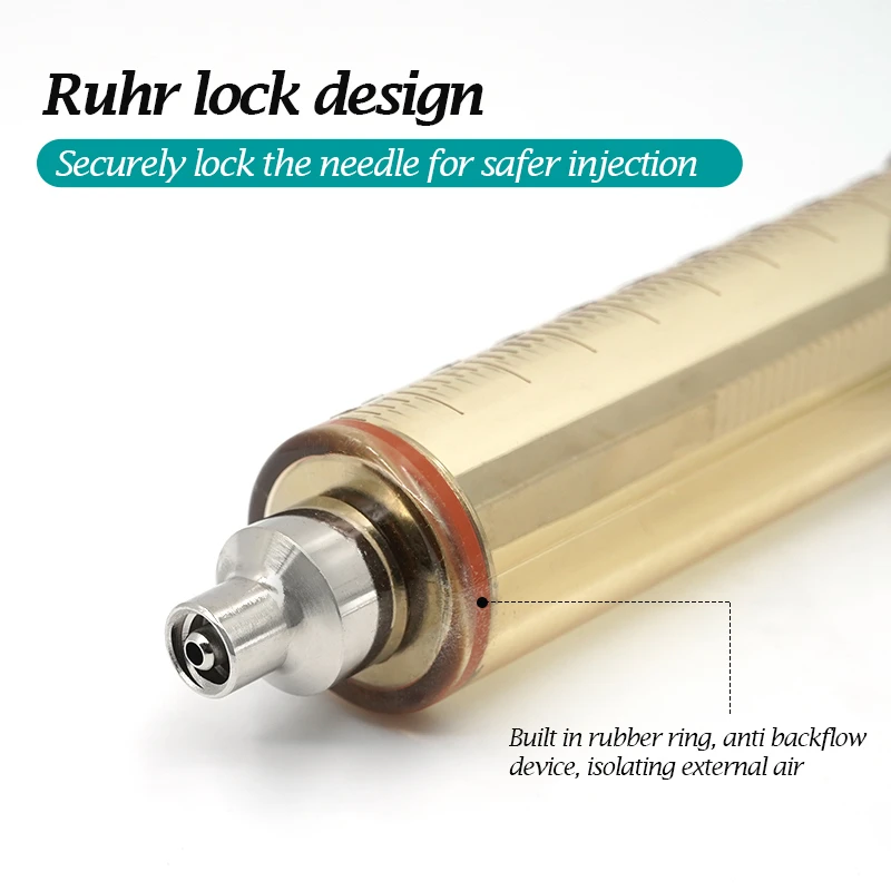 Ventajas de los detalles del producto1. Dispositivo anti-reflujoUn dispositivo especial antirreflujo está integrado en la articulación para aislar el aire externo y garantizar la inhalación completa de la medicina líquida.2. Diseño de aguja incomparableDiseño de cilindro de plástico de alta parte de grado médico, resistente a la esterilización por desinfección a alta temperatura 134, alta calidad para usted.3. SÚPER ultra precisiónUn diente dentado es un mililitro.4. Botón de bloqueo para una inyección más precisaSujete suavemente el mango, el botón saltará automáticamente y bloqueará la barra de la jeringa, para evitar disparos accidentales causados por una fuerza externa. Presione el botón negro para desbloquear la barra de la jeringa y extraer el líquido.5. Diseño cómodo nunca antes experimentadoMango de aluminio fundido ultraligero, diseño ergonómico, libre de toda inyección atada, comenzando con comodidad.